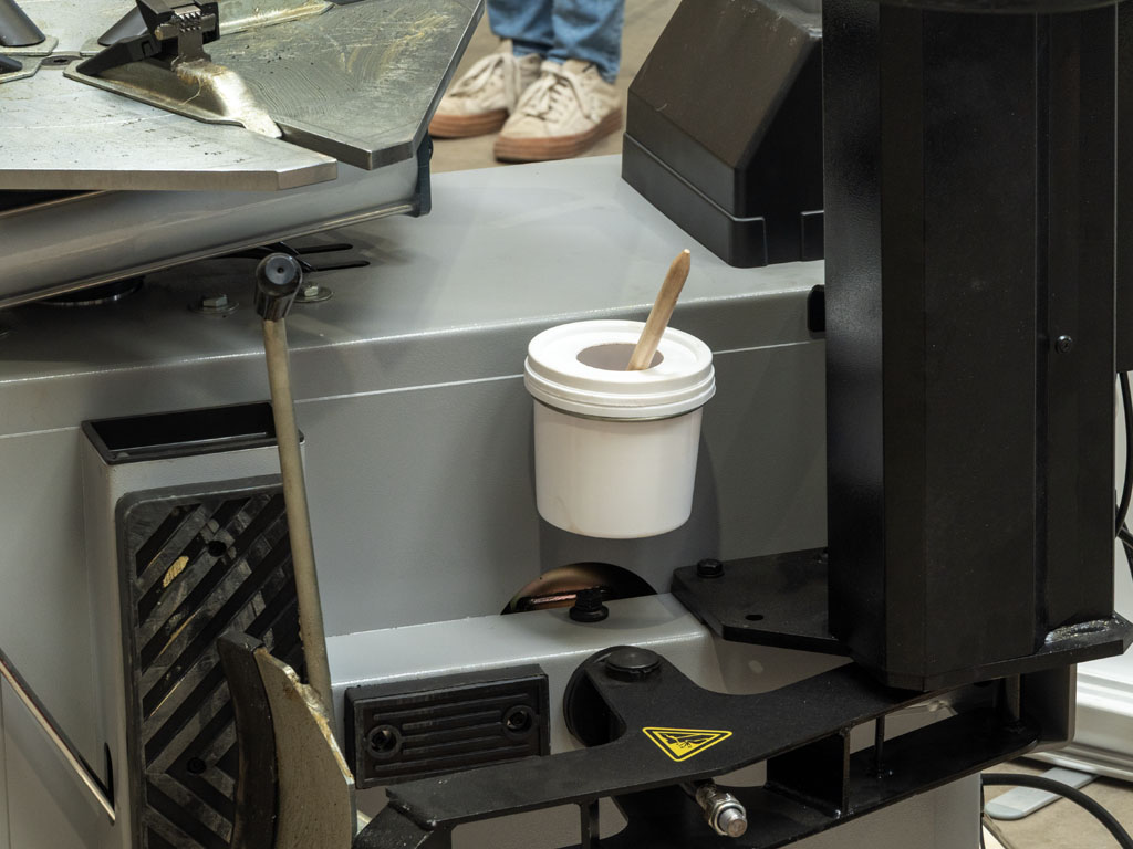 Prezúvačka je vybavená praktickým vstavaným držiakom na vedierko s montážnou pastou, čo uľahčuje prácu a zvyšuje komfort pri výmene pneumatík. Vďaka integrovanému držiaku máte pastu vždy po ruke.