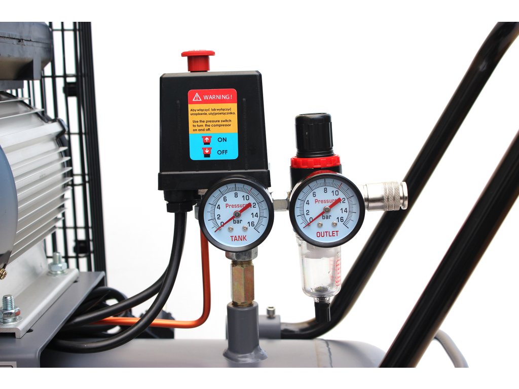 - Vybavený dvoma prehľadnými manometrami, ktoré ukazujú tlak. Jeden z nich je kombinovaný s redukčným ventilom a odlučovačom