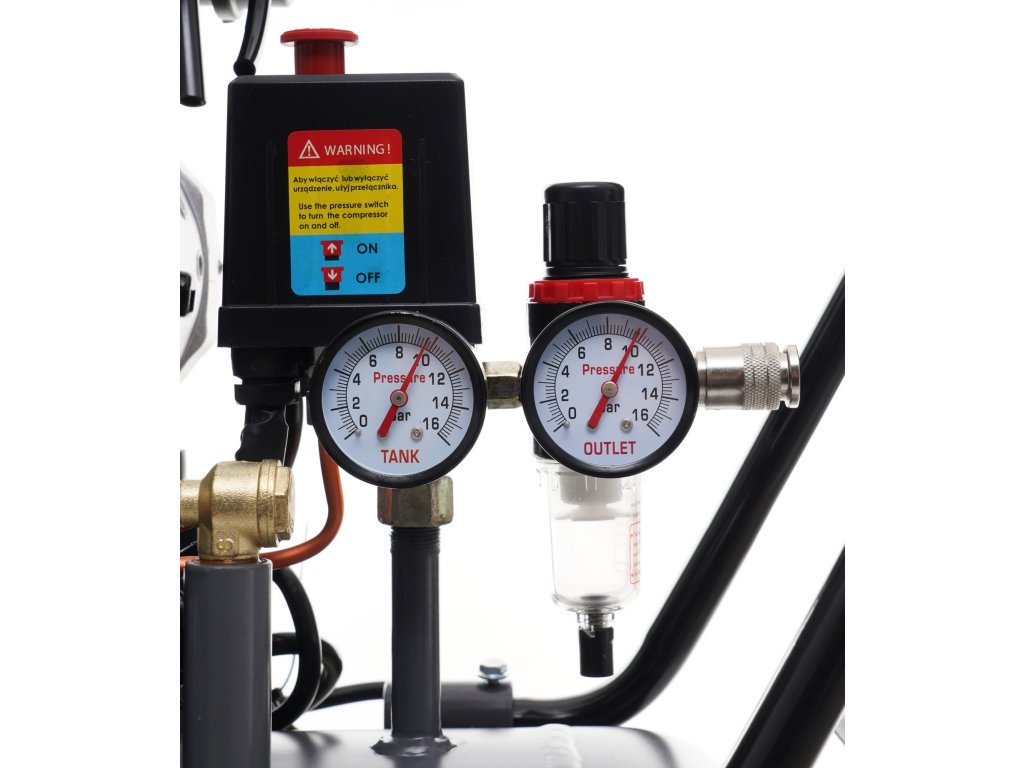 - Vybavený dvoma prehľadnými manometrami, ktoré ukazujú tlak. Jeden z nich je kombinovaný s redukčným ventilom a odlučovačom