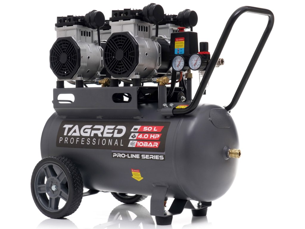 Výkonný bezolejový kompresor TAGRED s objemom 50 l a výkonom 4000 W. Konfigurácia R4 (2 čerpadlá, 4 piesty) zaručuje rýchle natlakovanie, vysoký výkon a spoľahlivú prevádzku bez olejovej údržby.