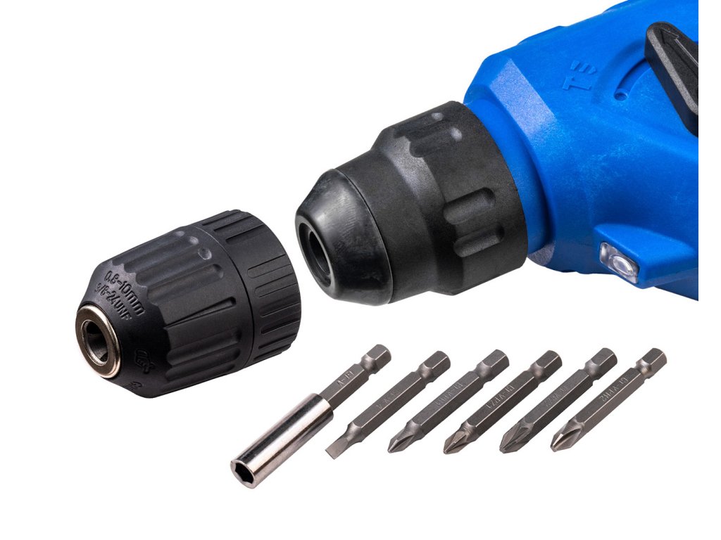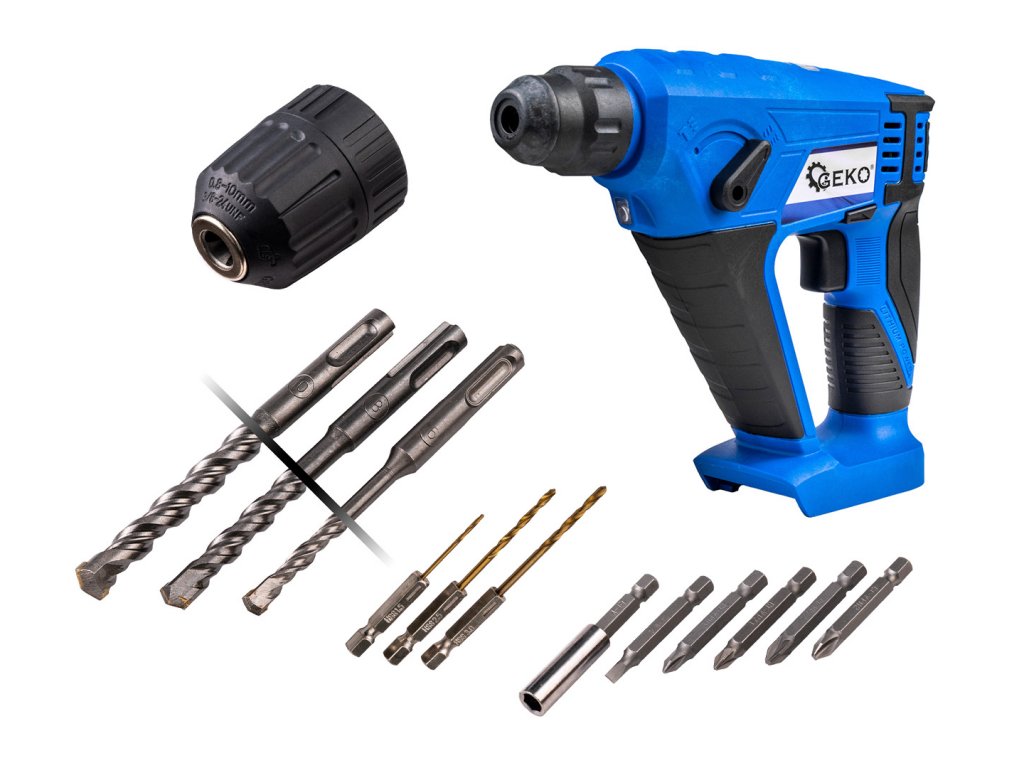 Akumulátorové vŕtacie kladivo vybavené upínaním SDS-Plus. Vŕtacie kladivo je vhodné pre prácu v dielni alebo doma. Okrem vrtákov s upínanom SDS-Plus je možné používať aj vrtáky s klasickým upínaním po výmene hlavice, ktorá je súčasťou balenia. Vŕtačka je vybavená LED osvetlením a prepínačom funkcií: klasické vŕtanie a vŕtanie s príklepom.