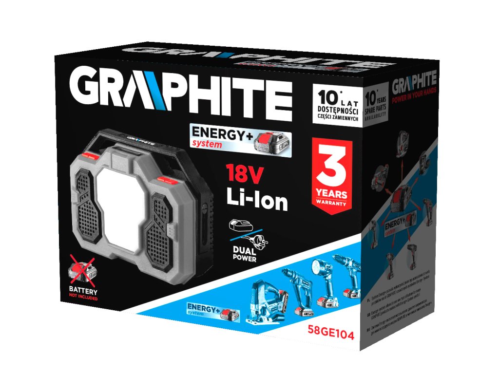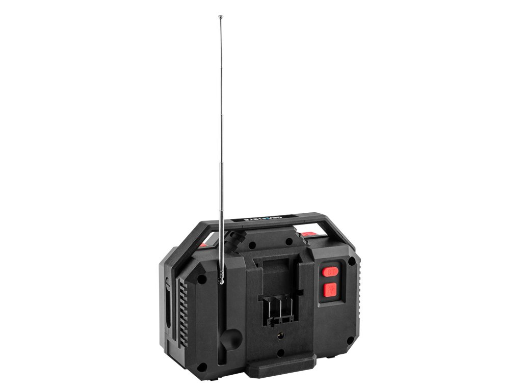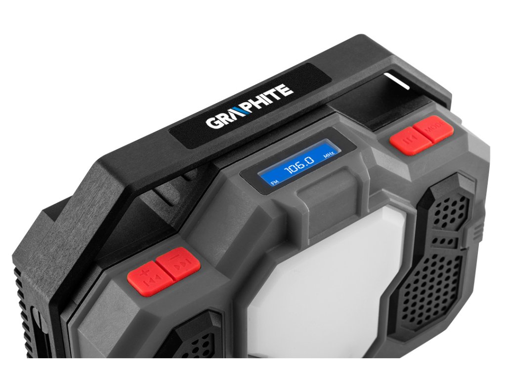 Akumulátorové rádio GRAPHITE Energy + 18 V Lithium-Ion bez akumulátora 58GE104 je prachu a striekajúcej vode odolné náradie na staveniská, do dielní a hál pre domácich majstrov. Napája sa buď sieťovým káblom, alebo 18 V lítium-iónovým akumulátorom (nie je súčasťou dodávky). Rádio má dva reproduktory s výkonom po 3 W, LCD displej, funkcie FM (87,5 - 108 mHz) a bluetooth, 15 W LED lampu s výkonom 21 W, sklopnú anténu, závit na montáž a 3-ročnú záruku od značky GRAPHITE. Toto rádio bude úspešným darčekom pre každého profesionála alebo domáceho majstra.