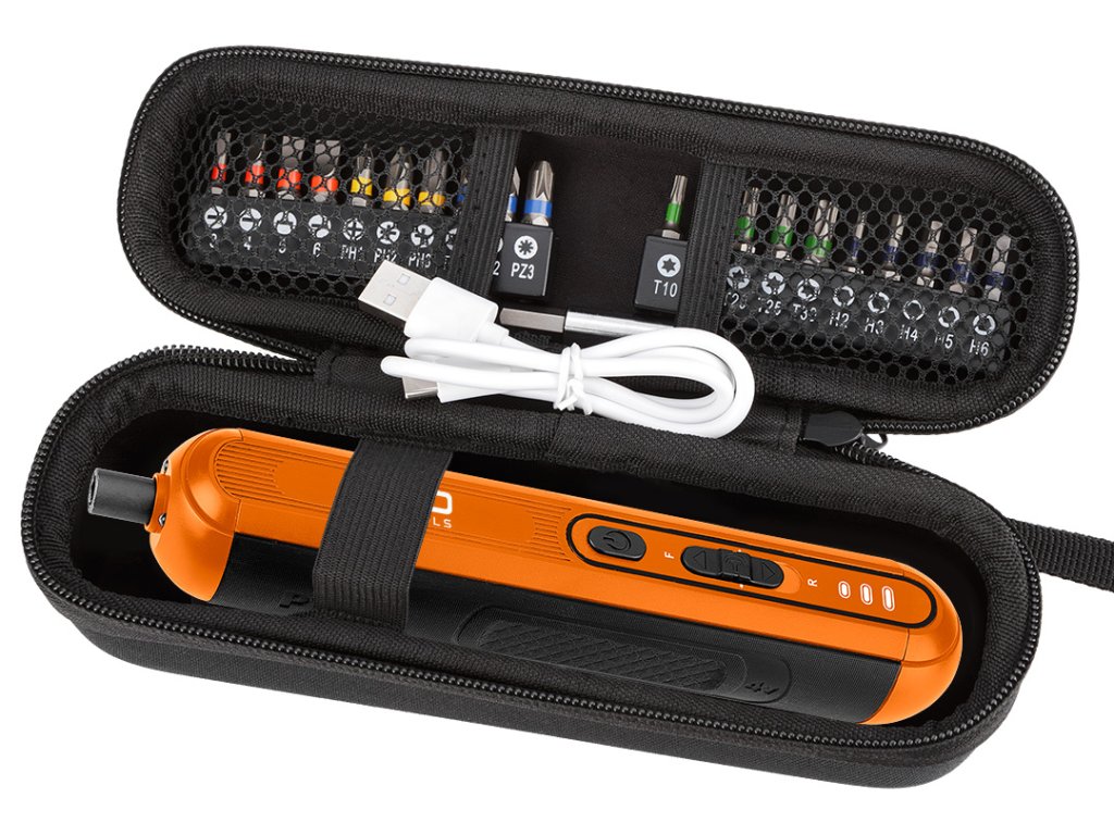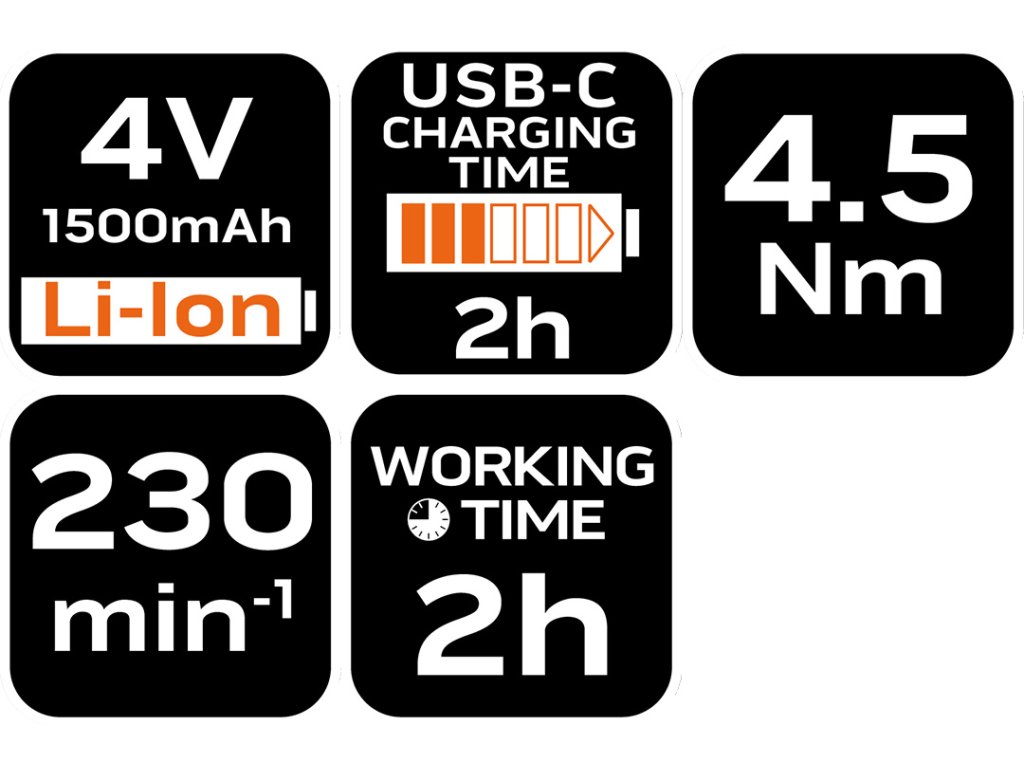 Akumulátorový skrutkovač 4 V, Li-Ion, USB-C, kapacita batérie 1500 mAh, prevádzkový čas 55 min, veľkosť pracovnej rukoväte: šesťhran ?" , otáčky: 230/min-1, krútiaci moment: (prevodový stupeň I / II / III): 2Nm / 3Nm / 4,5Nm, systém automatického štartu/stop, aretácia vretena, LED dióda, indikátor stavu nabitia, skrutkovacie bity 25 mm - 20 ks. (SL3, SL4, SL5, SL6, PZ1, PZ2, PZ3, T10, T15, T20, T25, T30, PH1, PH2, PH3, H2, H3, H4, H5, H6), hmotnosť 0,23 kg