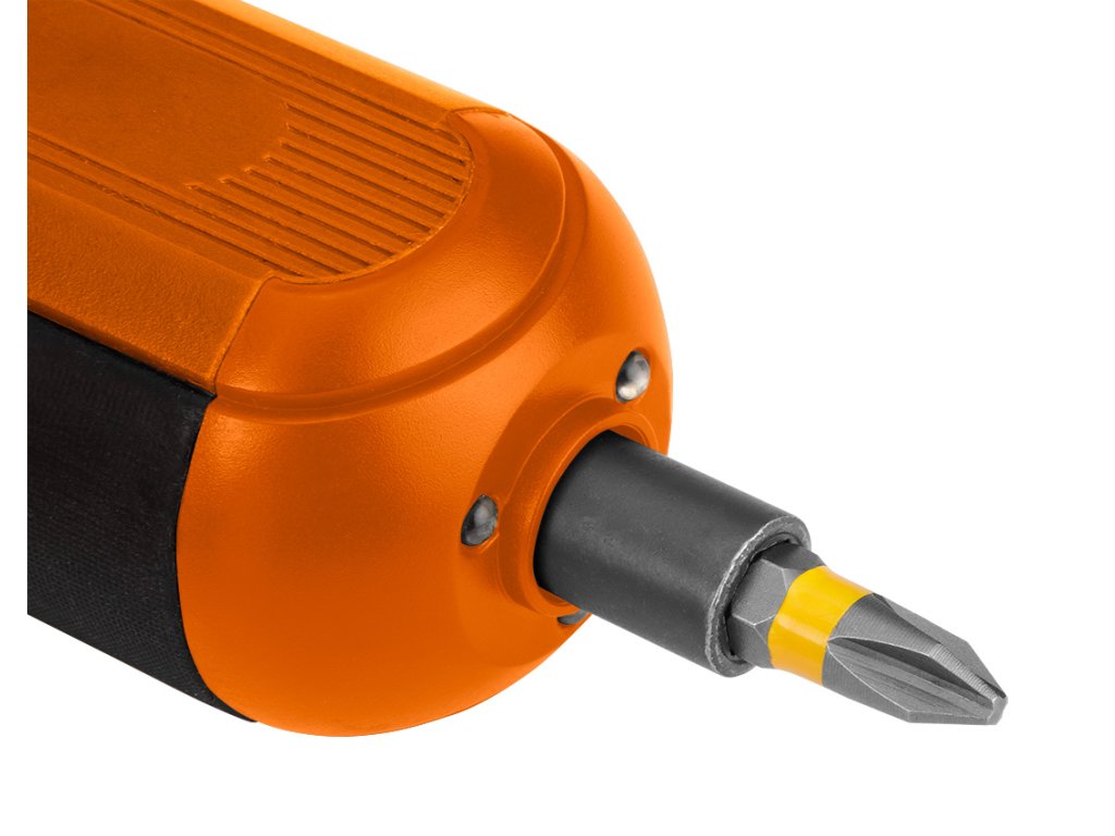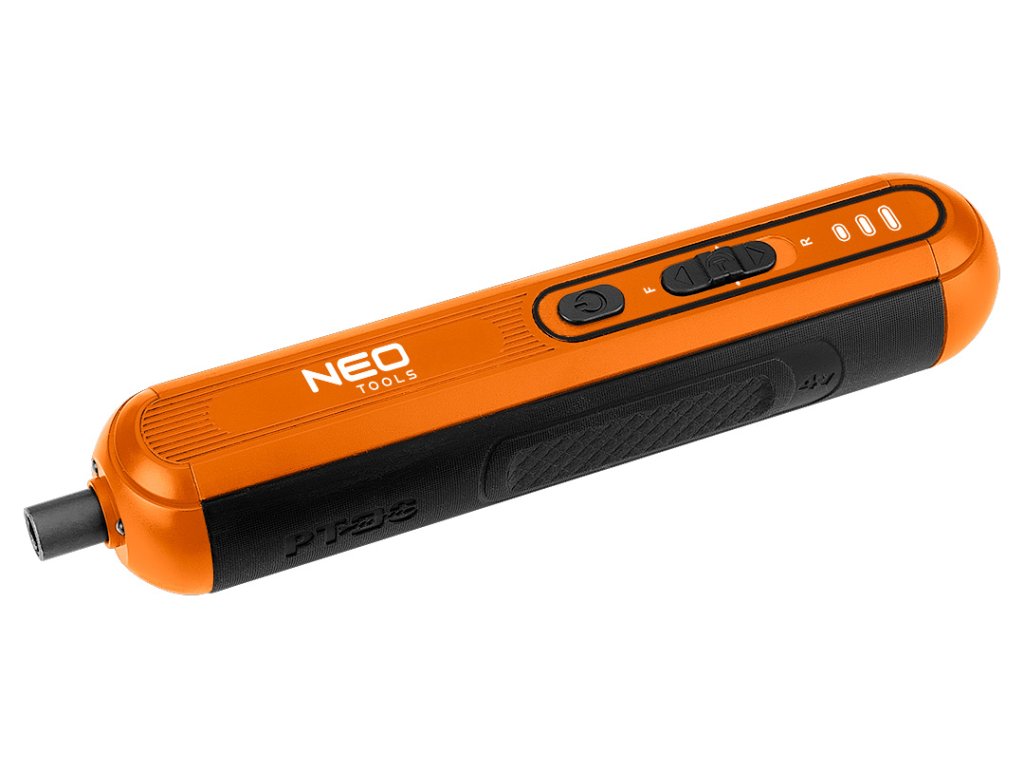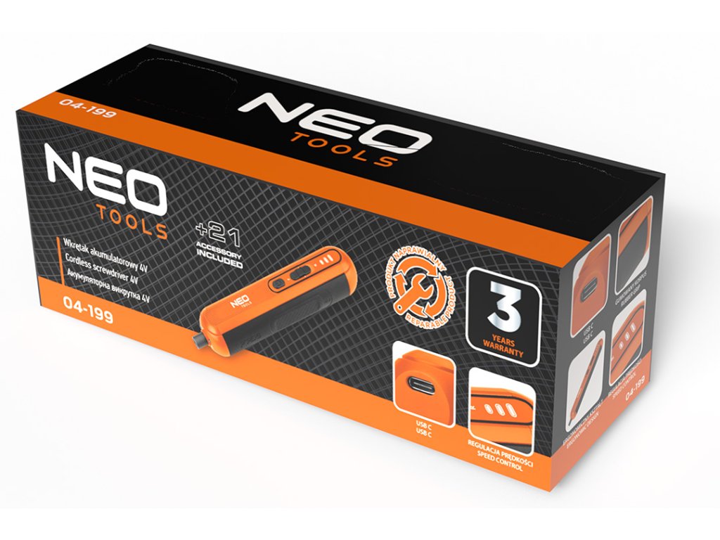 Akumulátorový skrutkovač 4 V, 04-199 od spoločnosti NEO TOOLS je šikovné zariadenie, ktoré bude nepostrádateľné v profesii elektrikára, zámočníka, ale aj pri úlohách domáceho majstra alebo mechanika. Nástroj sa vyznačuje napätím 4 V a kapacitou batérie 1 500 mAh. Nabíja sa prostredníctvom pripojenia USB C (nabíjačka nie je k dispozícii) a na plnú batériu ponúka až 55 minút prevádzky. Vďaka veľkosti pracovného skľučovadla HEX ?" je kompatibilný s mnohými druhmi príslušenstva. Sada ponúka 25 mm skrutkovacie bity (25 kusov: SL3, SL4, SL5, SL6, PZ1, PZ2, PZ3, T10, T15, T20, T25, T30, PH1, PH2, PH3, H2, H3, H4, H5, H6), 60 mm adaptér a nabíjací kábel. Akumulátorový skrutkovač NEO TOOLS má praktickú aretáciu vretena. Keď je otáčanie nastavené do správneho smeru (L/P) a skrutkovač je pritlačený k skrutke, automaticky sa aktivuje vďaka funkcii automatického spustenia/zastavenia. Otáčky nástroja sú 230 min-1 a jeho krútiaci moment závisí od prevodového stupňa - I - 2 Nm, II - 3 Nm a III - 4,5 Nm. K pohodlnému používaniu skrutkovača značky NEO TOOLS prispieva LED osvetlenie a indikátor nabitia. Je to nástroj, ktorý sa dobre drží v ruke a vyznačuje sa vysokou presnosťou otáčania.