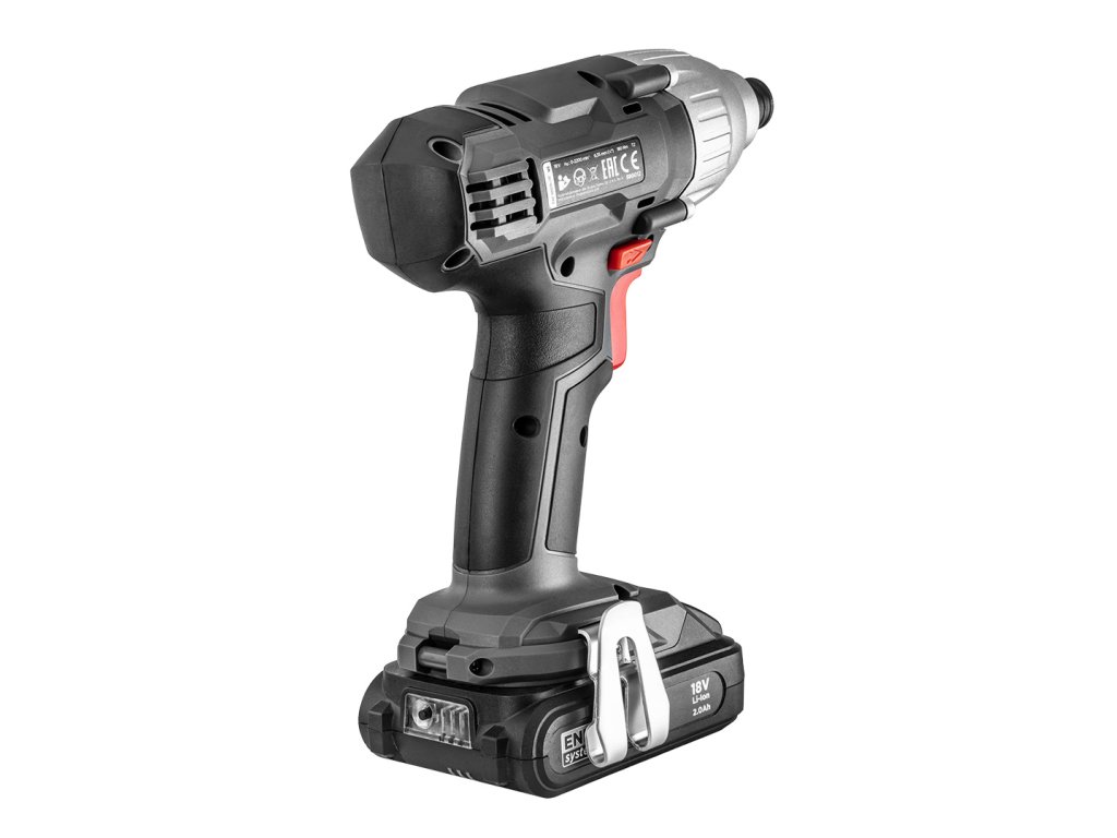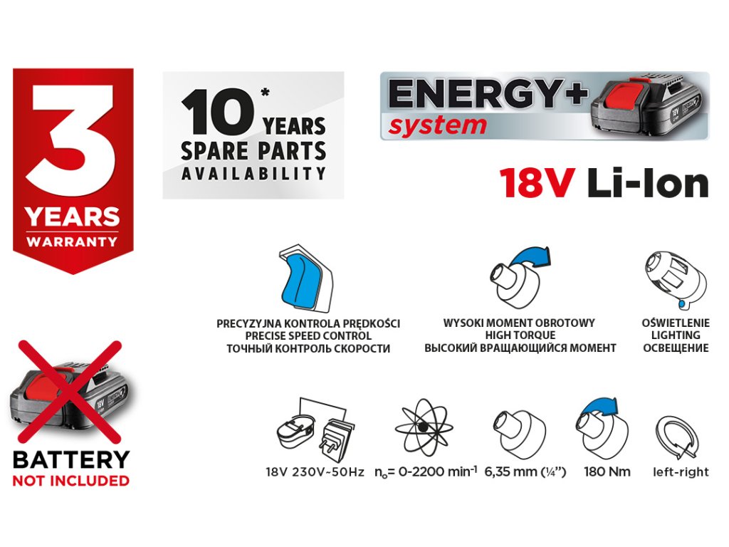 Akumulátorový uťahovač 18 V, Li-Ion, otáčky 0-2200 min??, vpravo/vľavo, krútiaci moment 180 Nm, skľučovadlo na náradie 6,35 mm (1/4"), brzda vretena, (LxH) 185 x 225 mm, hmotnosť 1,2 kg, kompatibilný s akumulátormi Energy+