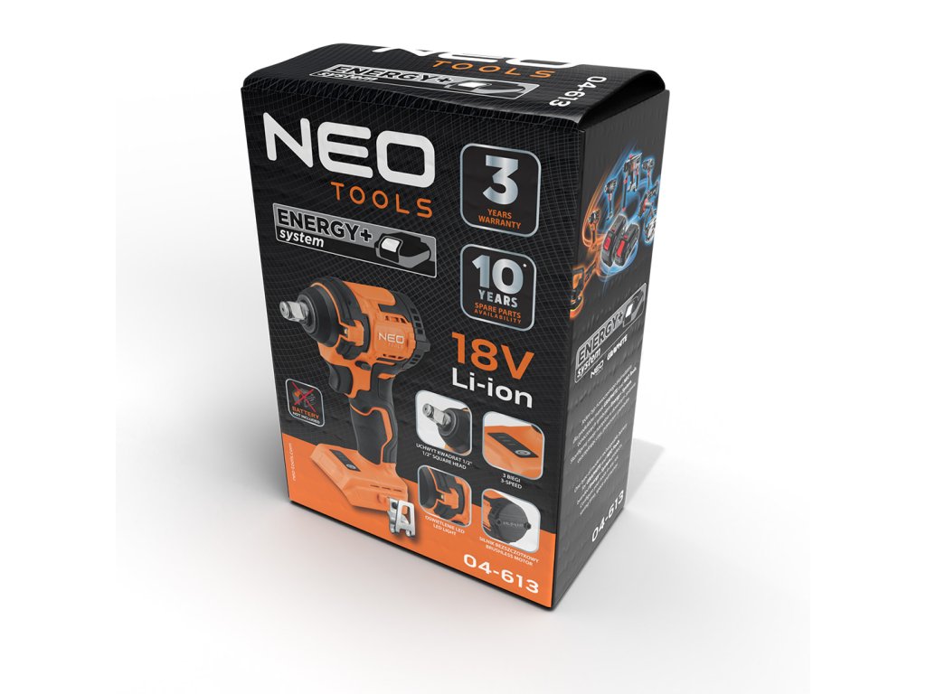 Kompaktný 1/2'' bezkartáčový uťahovák Energy+ 04-613 350 Nm od spoločnosti NEO TOOLS je zariadenie, ktoré funguje na základe akumulátorového systému Energy+. Je vybavený bezkartáčovým motorom s maximálnym krútiacim momentom pri odskrutkovaní 350 Nm a 1/2" montážou. Má tri prevodové stupne a široký rozsah otáčok ((prevod I / II / III) 0-1 500 / 0-2 000 / 0-2500 min-1), frekvencie úderov (0-1850/0-2500/0-3200 BPM) a krútiace momenty (prevod I/II/III) 80/200/320 Nm, max. 350 Nm. Kompaktný bezkartáčový kľúč NEO TOOLS má aj LED svetlo a praktické upevnenie na opasok. Osvedčí sa v mnohých situáciách a na ťažko prístupných miestach.