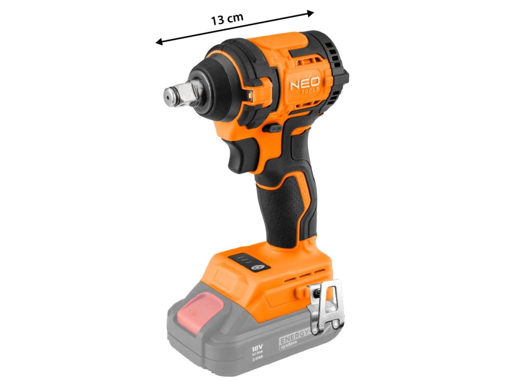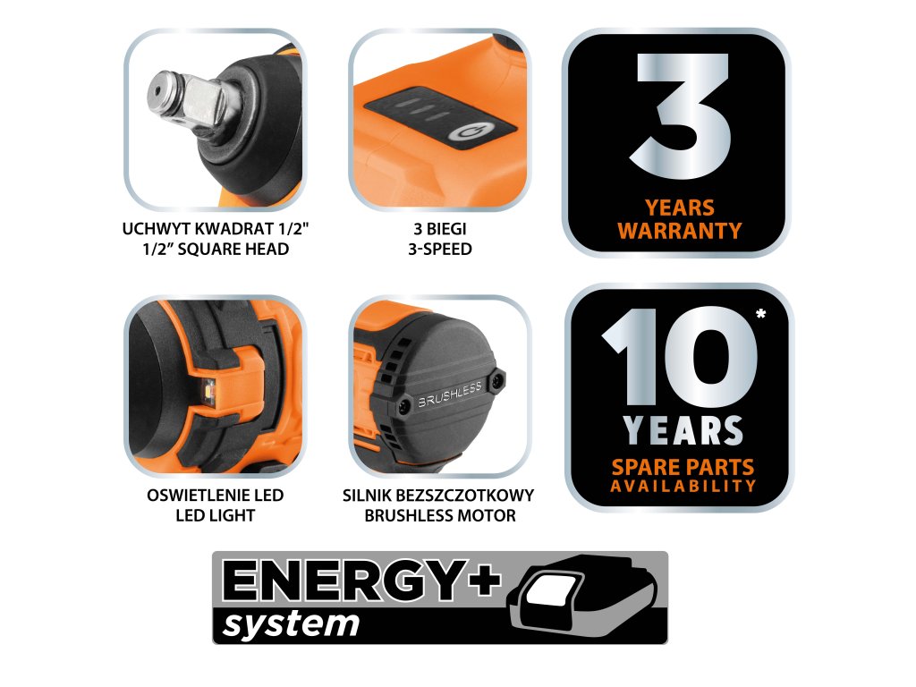 Bezkartáčový rázový uťahovák Energy+ 18 V, 350 Nm, kompaktný - dĺžka 13 cm, 1/2" držiak nástroja, LED osvetlenie. Otáčky (prevodovka I / II / III) 0-1 500 / 0-2 000 / 0-2500 min-1. Max. frekvencia úderov (prevodovka I/II/III) 1 850/2 500/3 200 BPM, krútiaci moment (prevodovka I/II/III) 80/200/320 Nm, max. 350 Nm, doba prevádzky na batériu: 2Ah-80min, 4Ah-175min, 6Ah-255min, 8Ah-340min. Hmotnosť 1,1 kg
