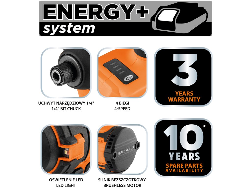 Enerygy+ 18V bezkartáčový rázový uťahovák, 300 Nm, kompaktný - 12 cm dlhý. 1/4" šesťhranný držiak nástrojov, LED osvetlenie. Otáčky (prevod I/II/III/IV) 0-1 500/0-2 500/0-3 200/0-3 600 min-1. Max. frekvencia úderov (prevod I/II/III/IV) 1 800/3 200/4 000/4 500 BPM, krútiaci moment (prevod I/II/III/IV) 45/120/210/270 Nm, max. 300 Nm, doba prevádzky na akumulátor: 2Ah-90min, 4Ah-195min, 6Ah-285min, 8Ah-430min. Hmotnosť 0,85 kg