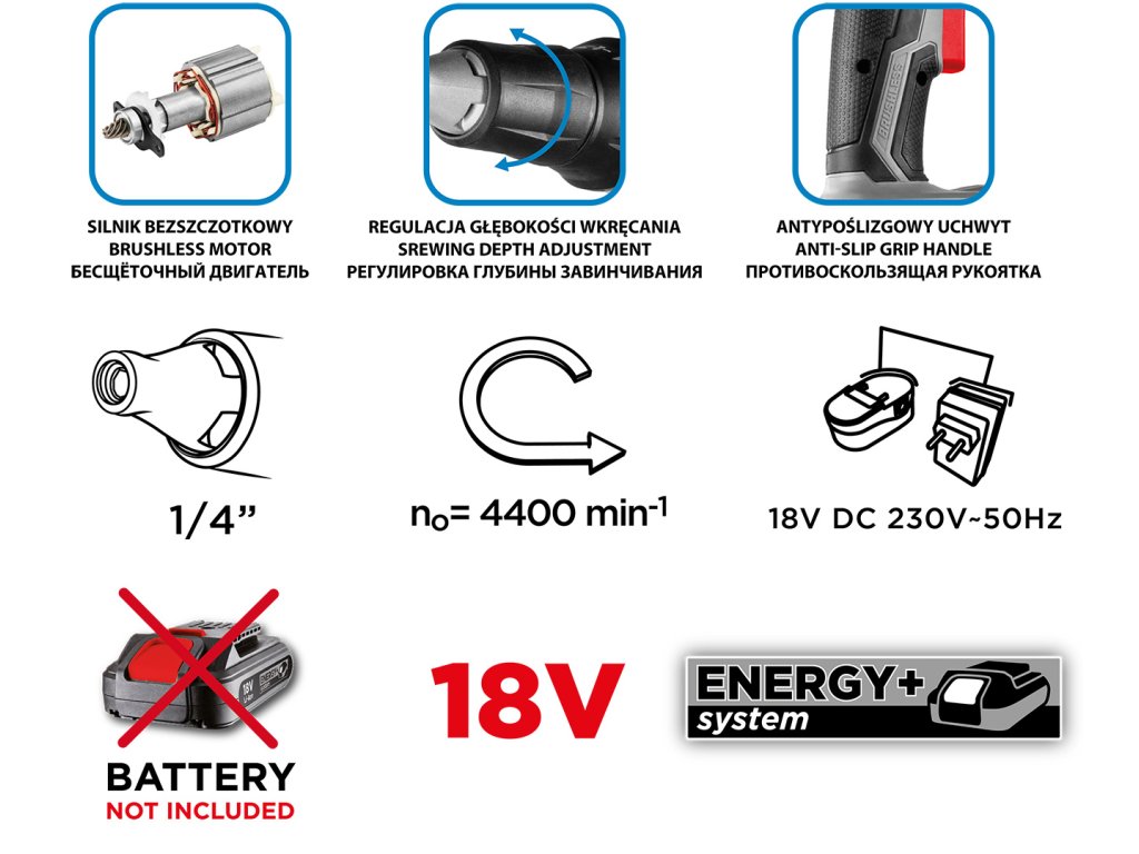 Bezkartáčový panelový skrutkovač Energy+ 18 V Li-lon, 0-4400 ot/min, 1/4" rukoväť, 58GE111