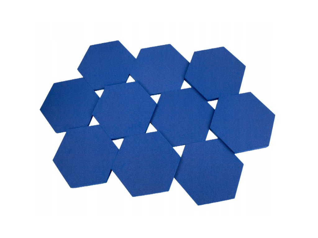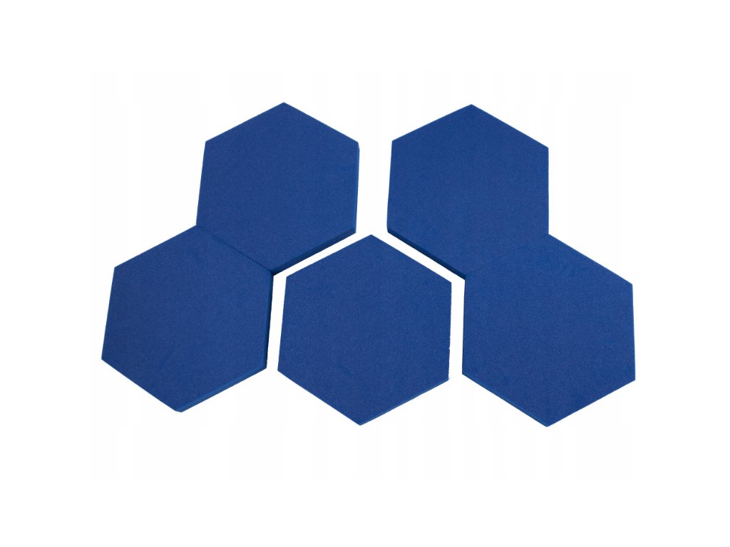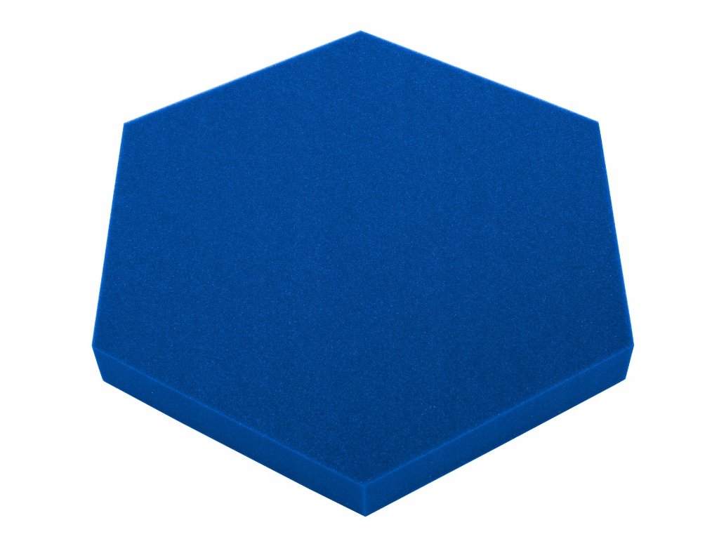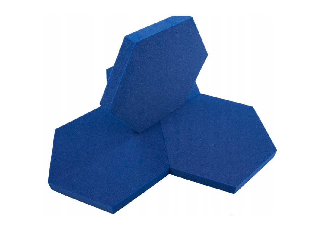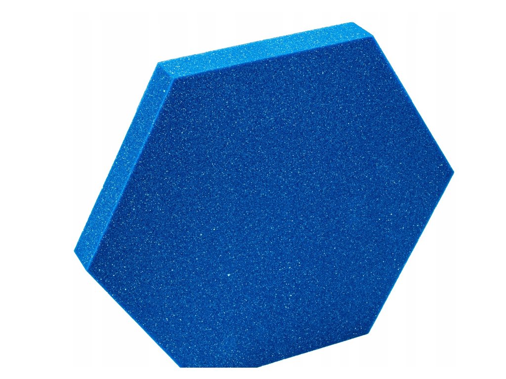 Dekoračný akustický panel hexagon 50×50 cm, hrúbka 5 cm. PU pena, redukuje echo a dozvuk. Jednoduchá montáž. Farba: modrá.