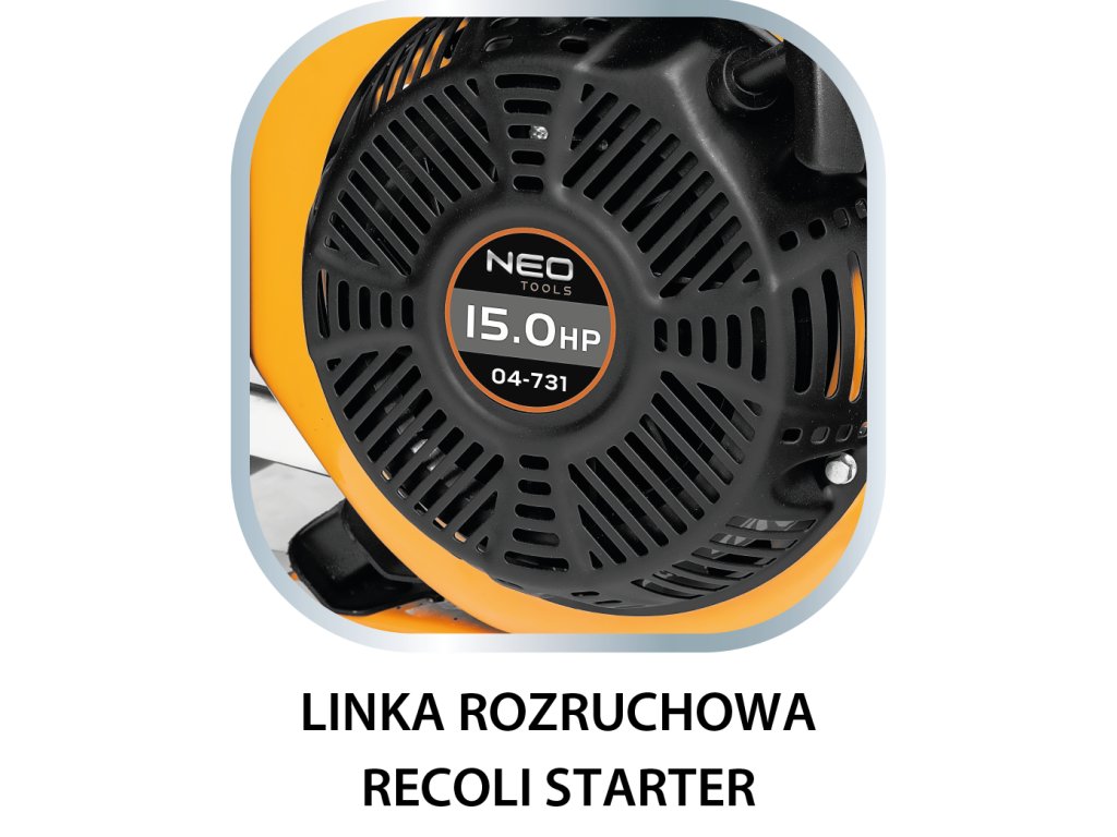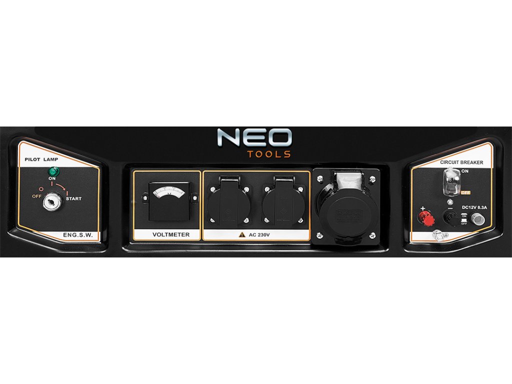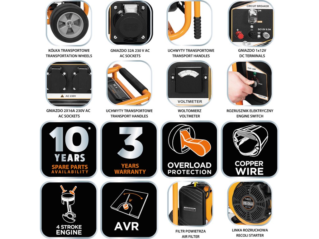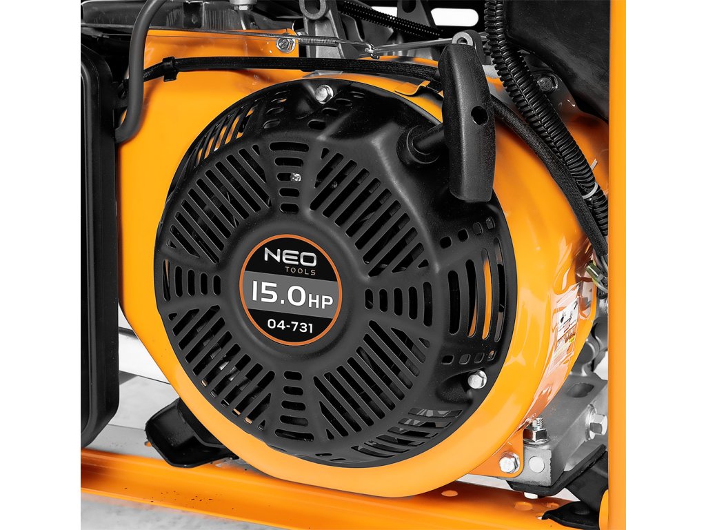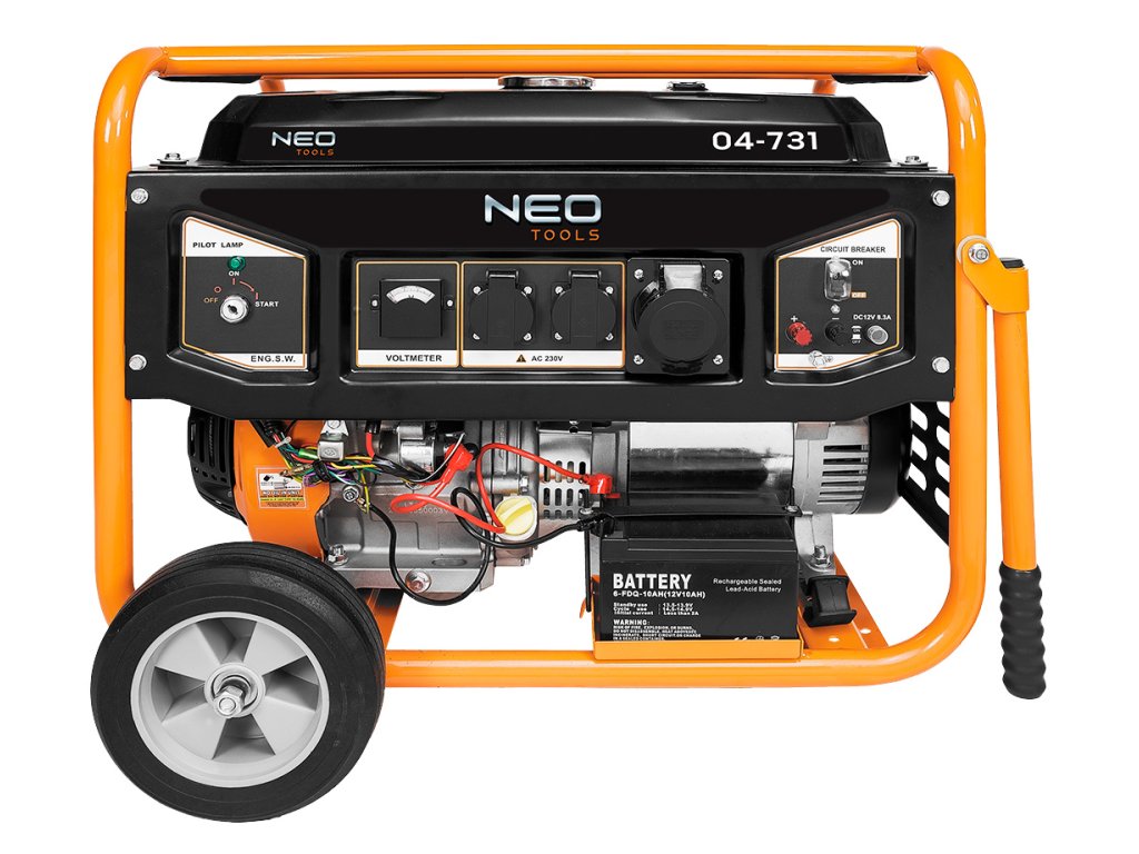 Generátor NEO 04-731 s výkonom 6 - 6,5 kW je profesionálny generátor s menovitým výkonom 6000 W a maximálnym výkonom 6500 W, určený na napájanie rôznych typov elektrických zariadení na miestach bez trvalého prístupu k elektrickej sieti. Je vybavený výkonným štvortaktným spaľovacím motorom s výkonom 11 kW/15 k na benzín 92, 95, 98 a spúšťa sa spínačom zapaľovania. Má 25-litrovú palivovú nádrž a 1,1-litrovú nádrž na olej. Má priemernú spotrebu paliva 4,89 l/h a minimálnu spotrebu 0,313 g/kWh. Spĺňa normy EURO V a má zabudovaný systém AVR, ktorý účinne stabilizuje napätie na výstupnej zásuvke, ako aj nadprúdovú ochranu. Jeho rozmery sú 815 x 530 x 560 mm a hmotnosť 87 kg. Dosahuje 3 000 otáčok za minútu, má zdvihový objem 420 cm3, LwA = 97 dB. Typ zapaľovacej sviečky F6RTC a 1x 12V + 2x230V (16A) + 1x 230 (32A) zásuvka. Prepravu uľahčujú pripevnené kolieska a rukoväte. Jednotka odporúčaná pre mnohé aplikácie.