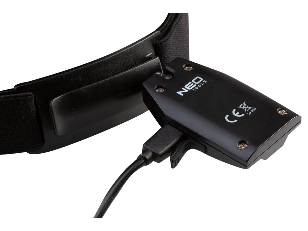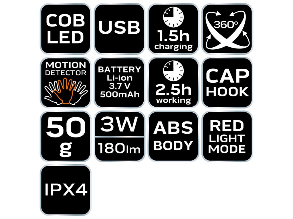 USB dobíjateľná čelová baterka 180 lm COB LED + snímač pohybu NEO (ref. 99-069) je vybavená COB LED so svetelným tokom 180 lumenov a výkonom 3 W. Baterka má funkciu zapnutia snímača pohybu a červeného svetla. Otočná hlava o 360 stupňov uľahčuje nastavenie osvetlenia. Telo je vodotesné a spĺňa normu IPX4 (ochrana proti striekajúcej vode z akéhokoľvek smeru). Napája sa z 3,7V Li-Ion batérie s kapacitou 500 mAh, ktorá je súčasťou balenia. Súčasťou balenia je čelenka, kábel USB a klip s háčikom.