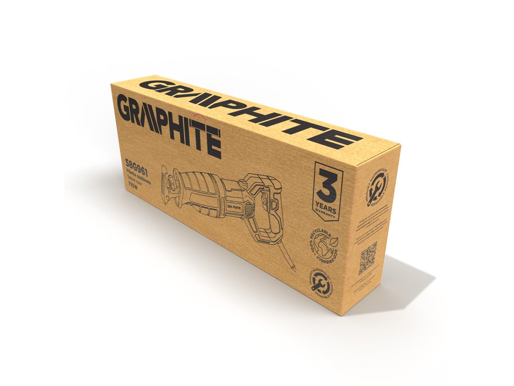 Chvostová píla GRAPHITE 710W 58G961 je určená na rezanie dreva, kovu a plastov. Umožňuje pracovať s materiálmi do hĺbky 115 mm pre drevo a 8 mm pre oceľ. Má robustný kryt z nerozbitného plastu, ako aj reguláciu otáčok a vypínač na nepretržitú prevádzku. Píla má zdvih pílového kotúča 20 mm a dosahuje až 2 800 otáčok za minútu. Ergonomická rukoväť je potiahnutá mäkkým plastom. Nástroj sa ponúka s pílovými listami na drevo a kov. Súlad s európskymi bezpečnostnými normami zaručuje, že píla má certifikát CE.
