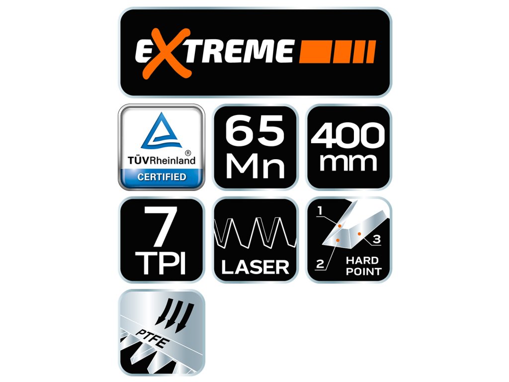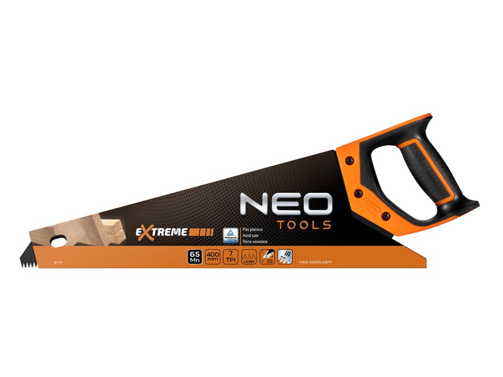 NEO príklepová píla (ref. 41-111) s dĺžkou pílového kotúča 400 mm. Ľahká, ale robustná konštrukcia na efektívne a rýchle rezanie. Trojstranne naostrené a indukčne kalené zuby dodatočne pokryté ochrannou vrstvou PTFE výrazne znižujú rezný odpor a uľahčujú rezanie dreva pozdĺž vlákien. Zúbkovanie 7 zubov na palec umožňuje rýchle a hrubé rezanie. Vysoká odolnosť ocele zaručuje dlhú životnosť. Ergonomická rukoväť s protišmykovým materiálom na bezpečné a stabilné vedenie počas rezania. Na hrane píly je praktická stupnica.
