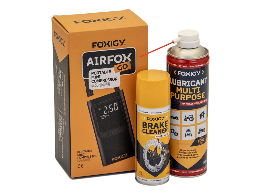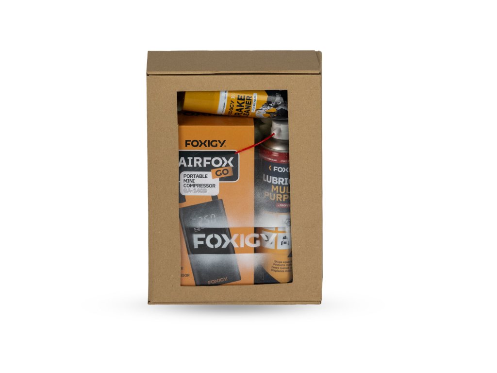 Darčeková sada Cyklista plná Foxigy produktov. Minikompresor AirFox Go, univerzálne mazivo a čistič bŕzd v darčekovom balení sú produkty, ktoré určite potešia každého cyklistu, motorkára či domáceho majstra.