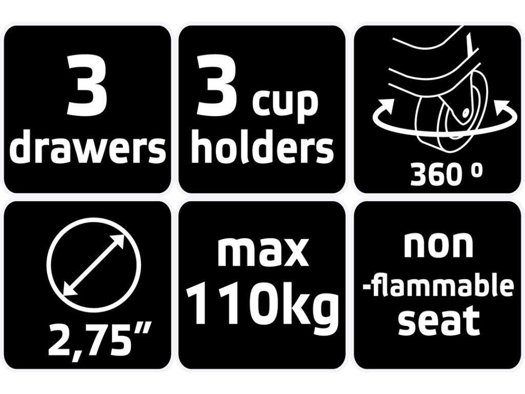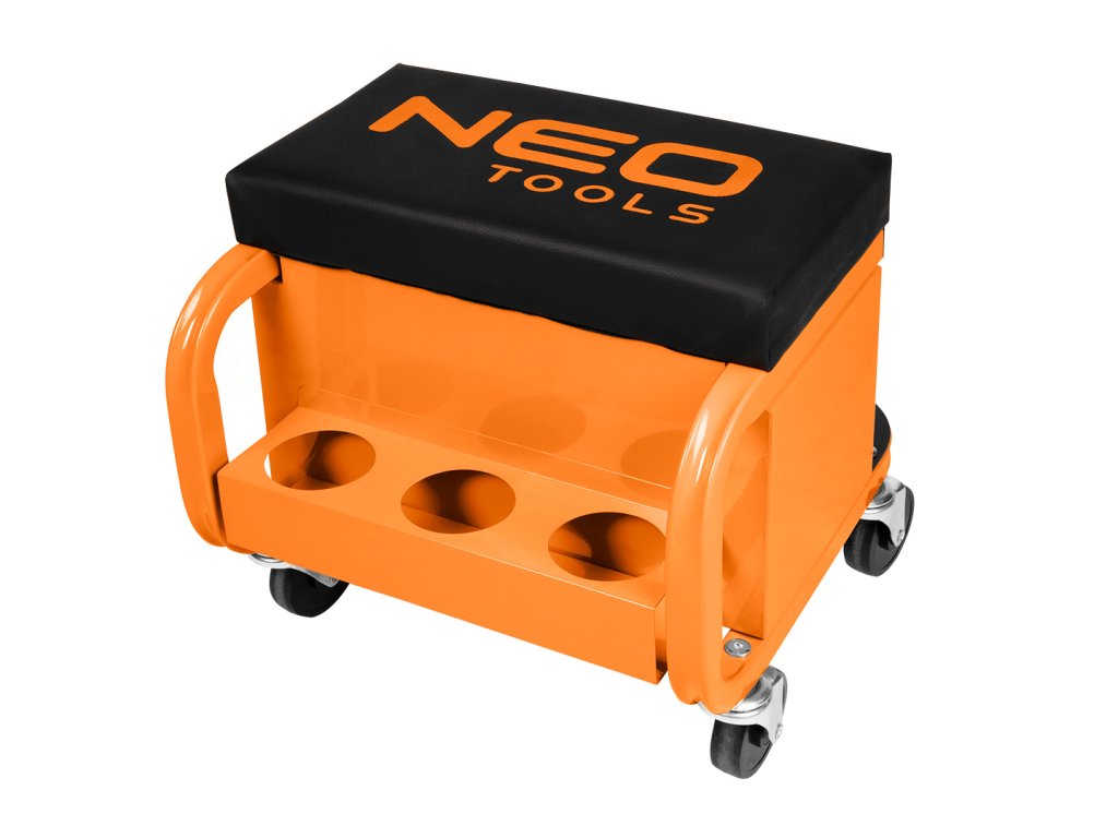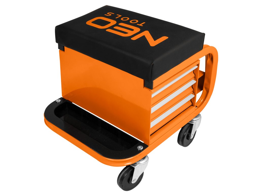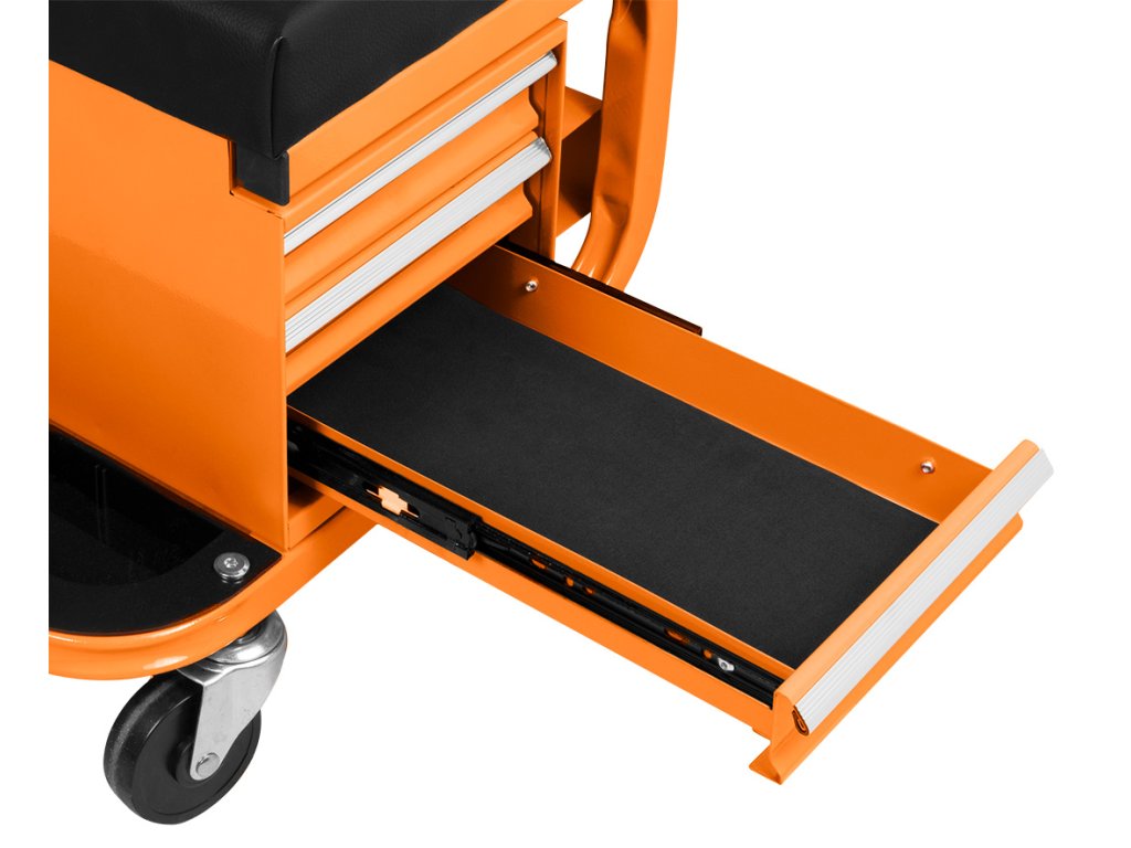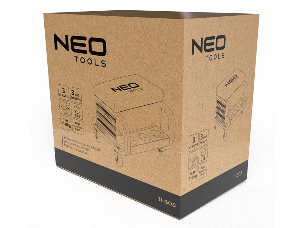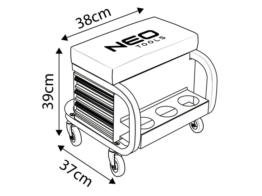 Pracovný stôl na kolieskach so zásuvkami na náradie 11-605 od spoločnosti NEO TOOLS je robustná stolička s pevnosťou do 110 kg. Má celkové rozmery 38 x 39 x 37 cm a rozmer jednej zásuvky 30 x 15 x 4 cm. Vybavená štyrmi kolieskami s možnosťou manévrovania v rozsahu 360 stupňov a tromi držiakmi na plechovky, fľaše alebo spreje poskytuje pohodlie a komfort. Vďaka práškovej povrchovej úprave zaručuje odolnosť farieb na dlhé roky. Pracovný stôl má čierne sedadlo z nehorľavého materiálu s oranžovým logom NEO TOOLS. Bude dobre fungovať počas mnohých hodín dielenských prác.