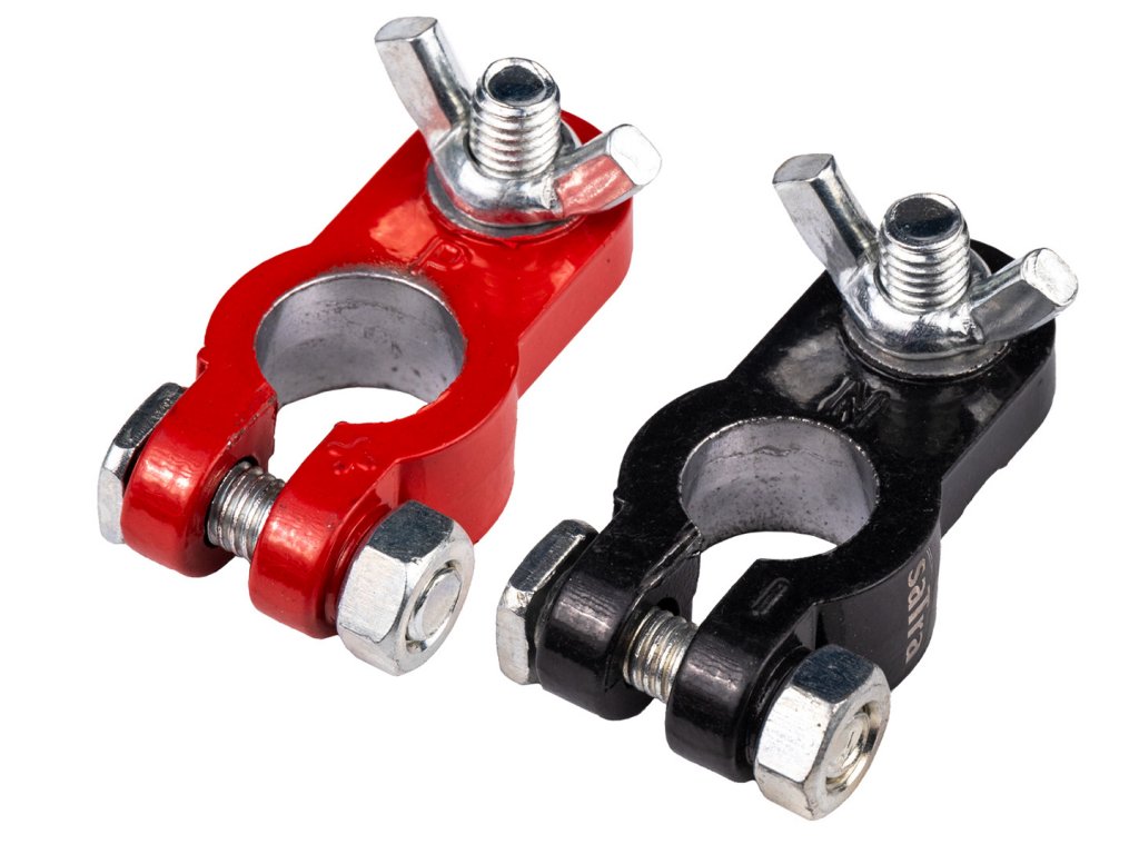 Čistý hliník poskytuje vynikajúcu elektrickú vodivosť. Konektory sú navrhnuté tak, aby vyhovovali všetkým štandardným horným batériám. 1ks kladná horná koncovka + 1 ks záporná horná koncovka - červená a čierna farba.
