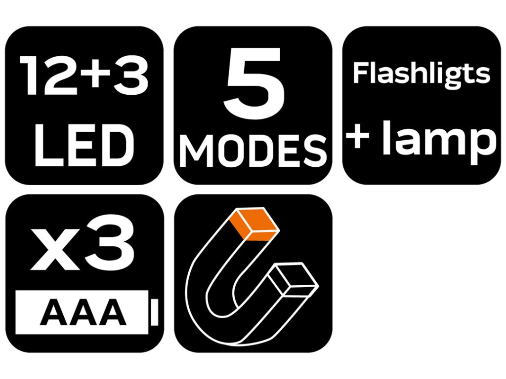 Dopravná výstražná svetlica 12+3 LED, funkcia baterky, napájanie tyčinkami AAA (nie sú súčasťou dodávky), magnet, ha, 5 svetelných funkcií, doba prevádzky 24 h na 3 AAA.