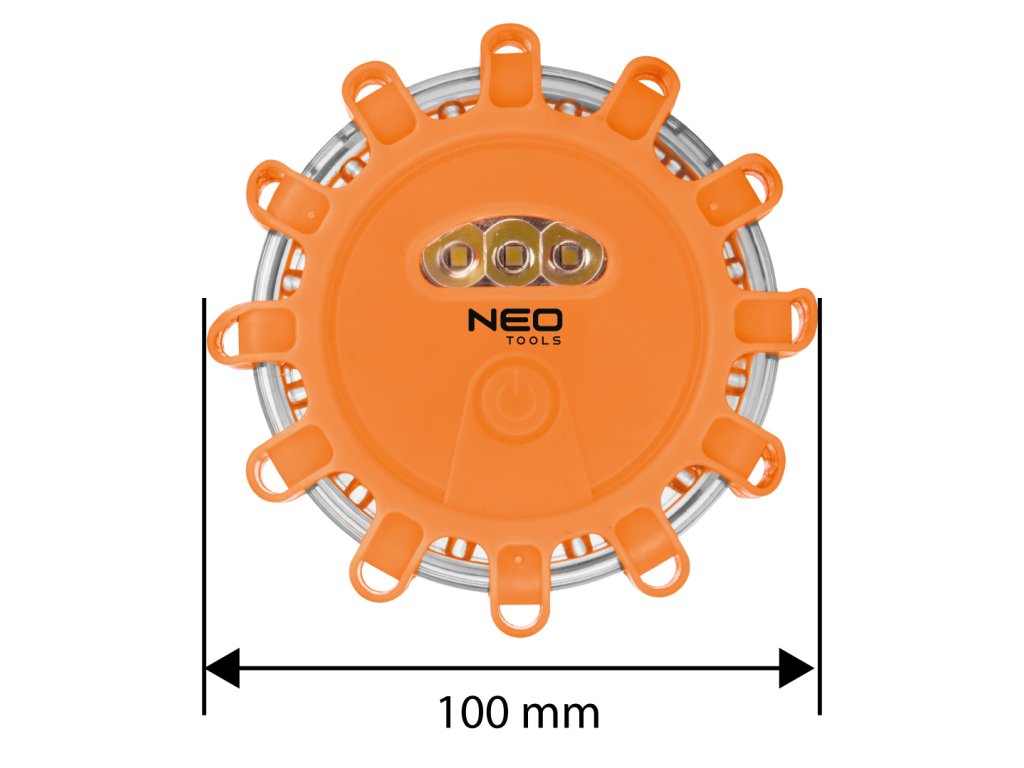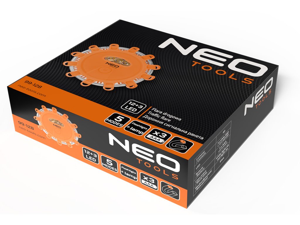 Výstražná cestná svetlica 99-128 od spoločnosti NEO TOOLS je svetelné výstražné zariadenie vybavené 12 LED diódami a 3 ďalšími LED diódami, ktoré fungujú ako baterka. Svetlica ponúka 5 druhov osvetlenia a jej prevádzkový čas je až 24 hodín. Napájaná 3 článkami AAA (nie sú súčasťou dodávky). Vďaka praktickému magnetu ju možno ľahko pripevniť na karosériu vozidla. Výstražná cestná svetlica NEO TOOLS zaberá vo vozidle málo miesta a vďaka dobrej viditeľnosti do diaľky zaisťuje bezpečnosť v núdzových situáciách. Odporúča sa ako trvalá výbava vozidla.