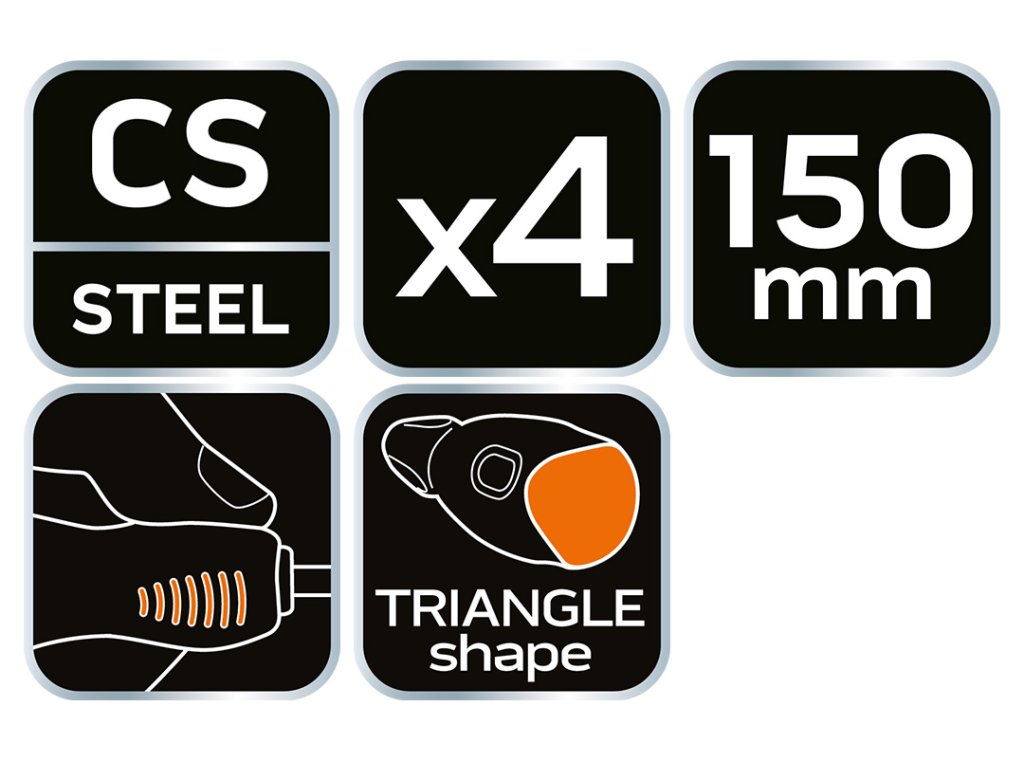 Háčiky 150 mm, sada 4 ks, CS oceľ, trojuholníkový tvar rukoväte, profilovaná opierka palca, rukoväť potiahnutá TPR plastom odolným voči chemikáliám, minerálnym olejom, tukom