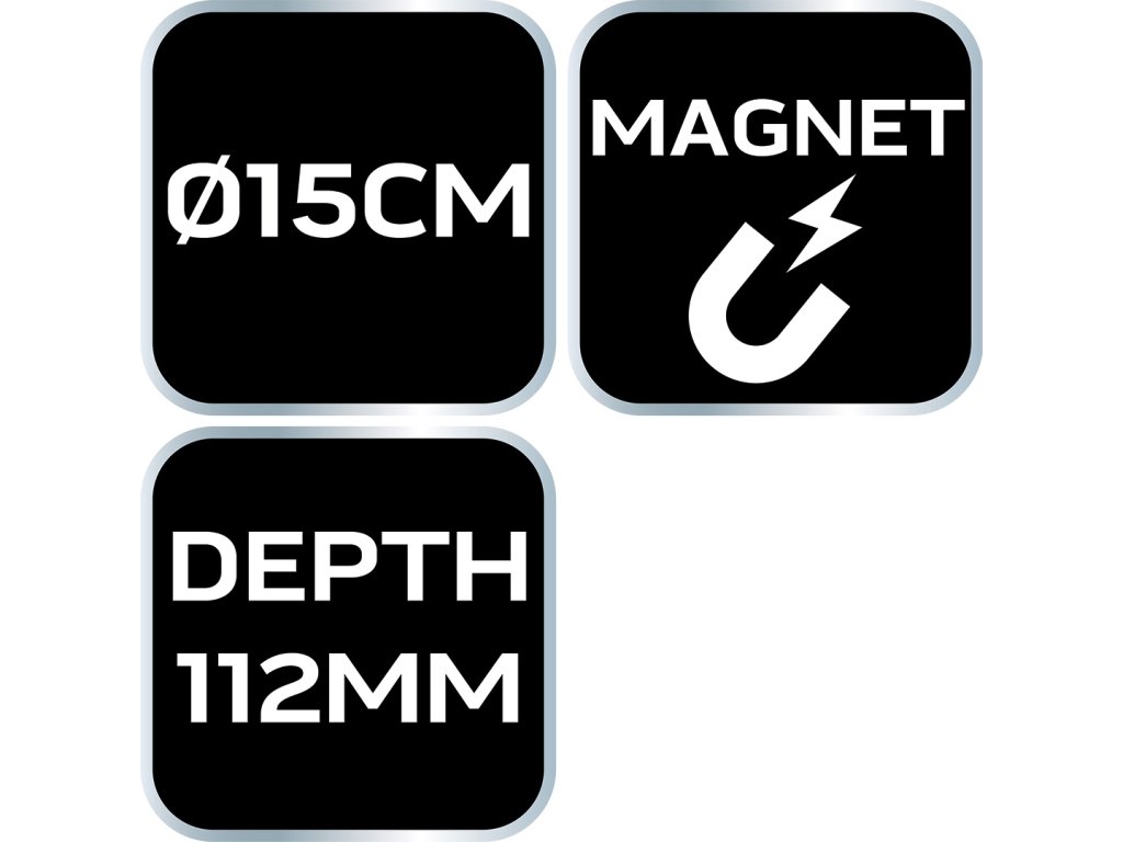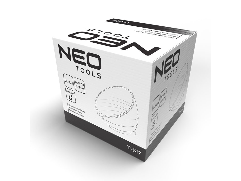 Magnetická miska, hranatá, priemer 150 mm 11-617 od spoločnosti NEO TOOLS je praktickým príslušenstvom do každej autodielne. Misa sa vyznačuje priemerom 148 mm a hĺbkou 112 mm. Je vyrobená z odolného plastu a má magnet s priemerom 80 mm a silou 1000-1200 gaussov. Je možné ju pripevniť na zvislé kovové plochy, ako sú blatníky alebo dvere opravovaného vozidla. Miska je určená na držanie kovových drobných predmetov na pracovnom stole. Vďaka vysokej odolnosti voči nárazom a mechanickej deformácii je ideálna na lepšiu organizáciu rôznych úloh.