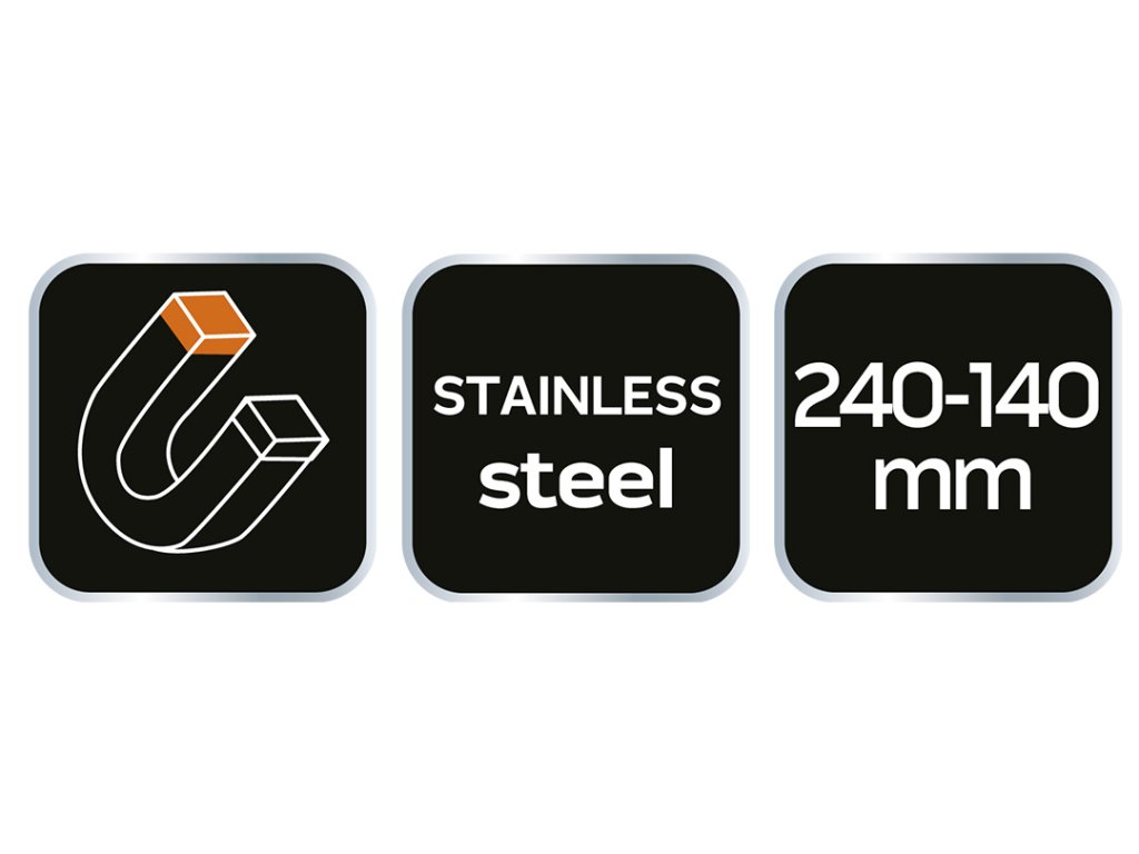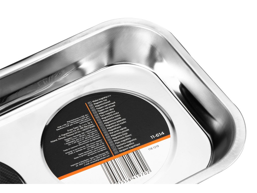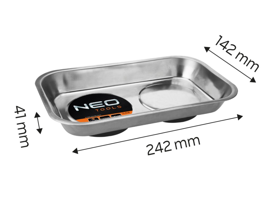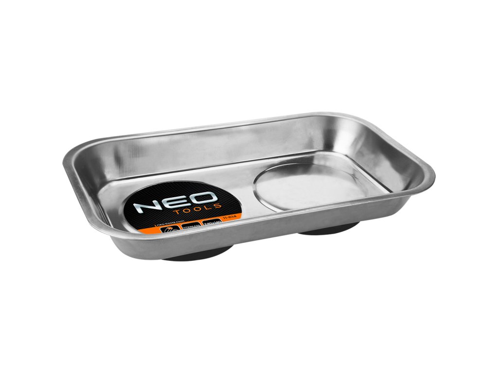 Magnetická miska, obdĺžniková 245 x 145 mm 11-614 od spoločnosti NEO je výrobok s rozmermi 245 x 145 mm. Je vyrobená z odolnej nehrdzavejúcej ocele a je odolná voči korózii. Misa má dva magnety s plastovým krytom, ktorý chráni jej povrch pred poškriabaním. Je určená na odkladanie malých kovových súčiastok a drobného náradia a skvele sa hodí do každej dielne. Misa značky NEO uľahčuje organizáciu a udržiavanie poriadku počas každodenných pracovných činností. Odporúča sa pre profesionálov a domácich majstrov.