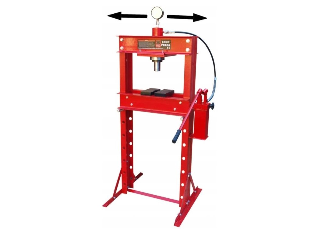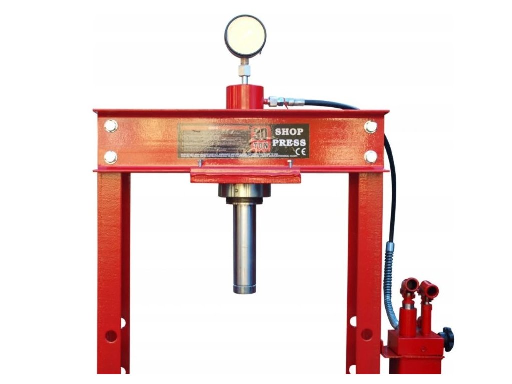 Hydraulický lis s maximálnym tlakom 30 ton vybavený dvojrýchlostnou bočnou pumpou pre pomalé a rýchle lisovanie predmetov.