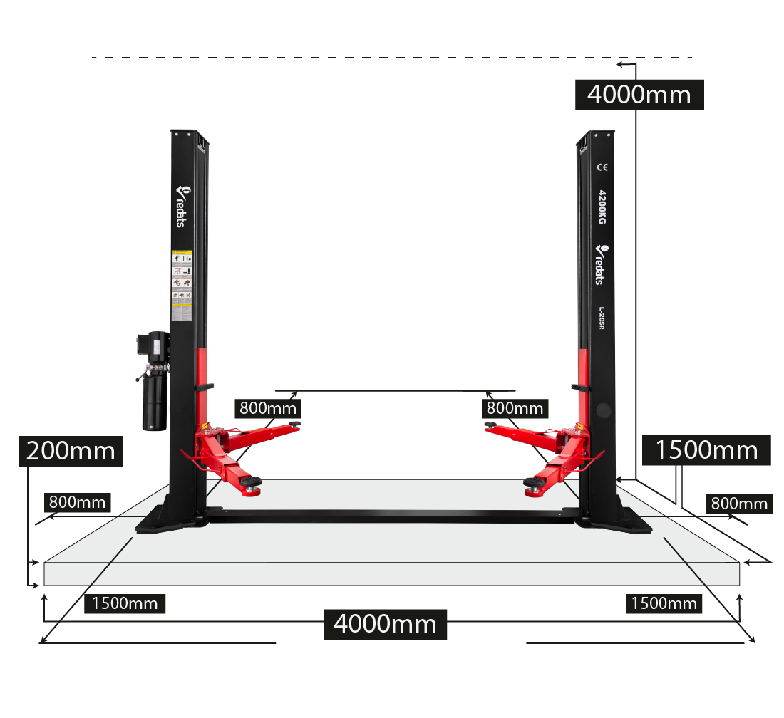 Profesionálny dvojstĺpový zdvihák REDATS L-205R, nosnosť 4,2 tony, teleskopické ramená, výška zdvihu 110–1910 mm, stabilita s rámom, 400 V