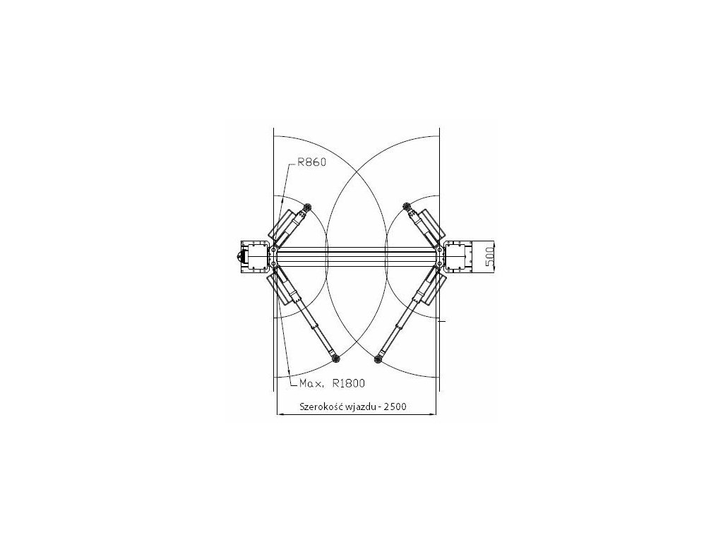 Lifting capacity 5 000 kg Lifting height 1 900 mm Minimum height 120 mm Arm length 860 - 1 800 mm Post height 2 848 mm Width between posts 2 810 mm Maximum vehicle width 2 500 mm Total width 3 650 mm Lifting time 60 s Electric power supply 400V/50 Hz Power 2,6 kW