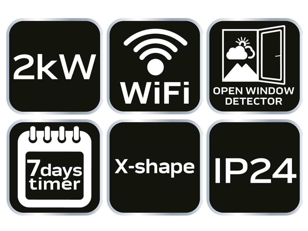 Elektrický konvektor 2000W, IP24, WIFI, ohrievač v tvare X, 24-hodinový programátor v jednotke, ovládanie cez aplikáciu TUYA, senzor otvoreného okna, senzor proti zamrznutiu, montáž na stenu a hliníkové nožičky v cene, rozmery výrobku 835 x 450 x 105 mm, vykurovacia plocha: 18-20m2