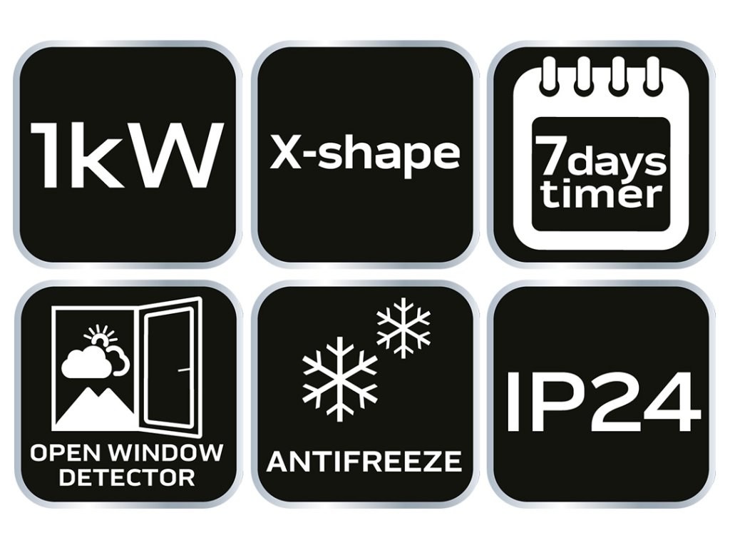 Elektrické konvektorové vykurovacie teleso 2000W, IP24, vykurovacie teleso v tvare X, týždenný programátor, diaľkové ovládanie, senzor otvoreného okna, senzor proti zamrznutiu, montáž na stenu a hliníkové nožičky v cene, rozmery výrobku 835 x 450 x 105 mm, vykurovacia plocha: 18-20m2