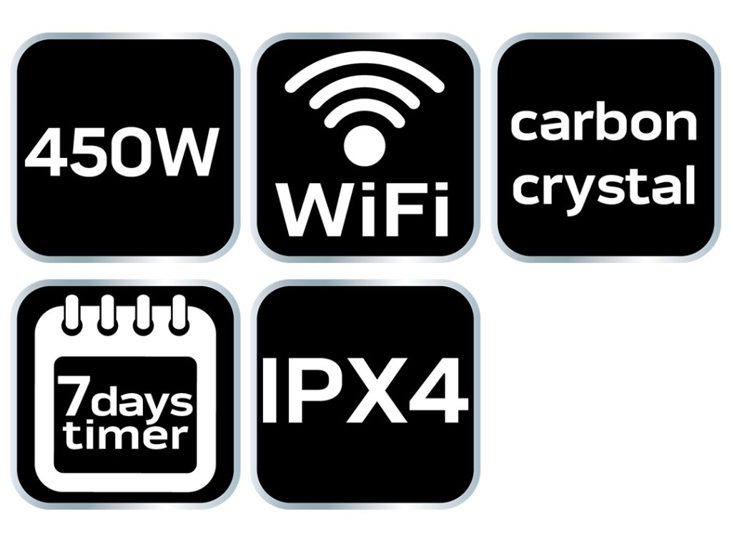 Infračervený vykurovací panel 450 W, LED displej, dotykové ovládanie na paneli, nastavenie teploty od 16-37 stupňov, nastavenie času až 9 h, ovládanie cez WiFi, ovládanie cez WiFi aplikáciu na týždennej báze, dva termostaty na ochranu pred prehriatím, príslušenstvo na montáž na stenu je súčasťou balenia, možnosť montáže na strop (nutné dokúpiť montážne príslušenstvo) alebo voľne stojace (nutné dokúpiť nožičky). Rozmery panela: 50*90*3,8 cm.