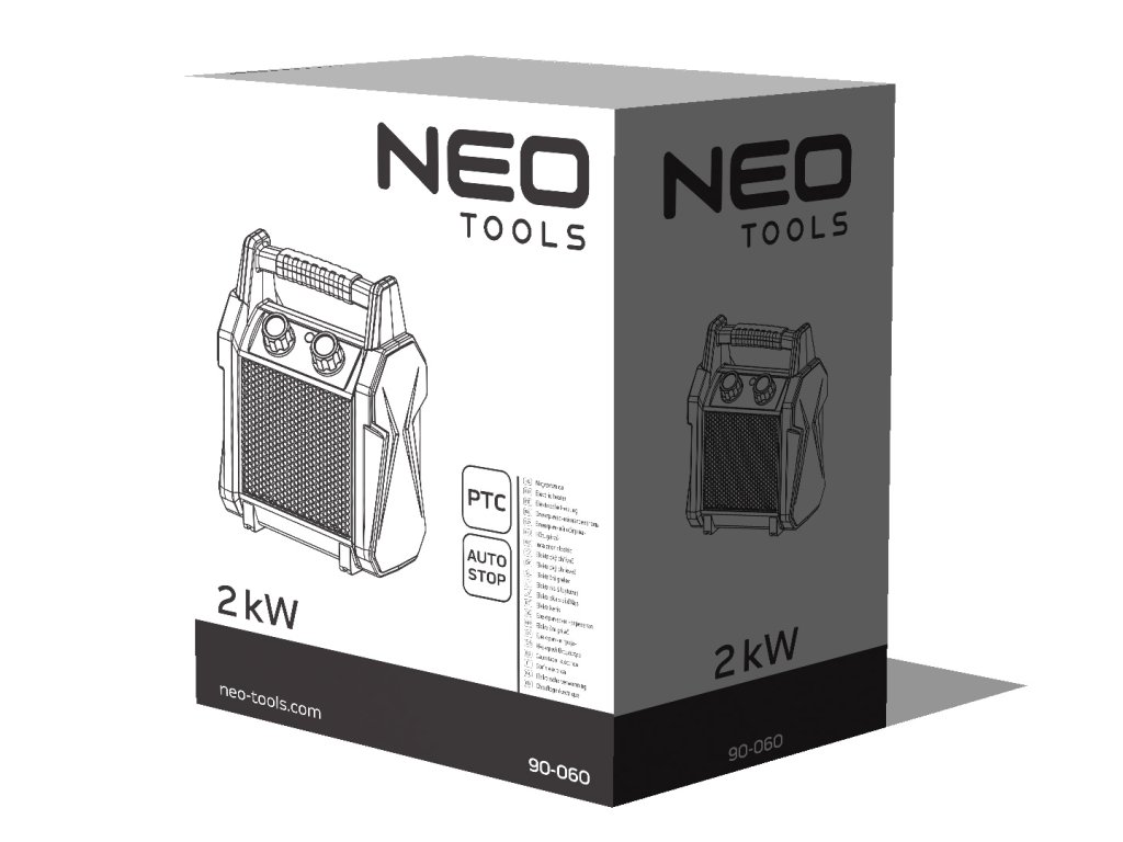 Keramický elektrický ohrievač PTC, 2 kW 90-060 od spoločnosti NEO je prenosný zdroj tepla, ktorý je určený na vykurovanie miestností, ako sú dielne, garáže, domácnosti a obchody. Keramické vykurovacie teleso a silný prívod vzduchu zabezpečujú rýchle vykurovanie na veľkú vzdialenosť pri zachovaní nízkej hladiny hluku. Ohrievač má izolovanú plastovú rukoväť na jednoduchú manipuláciu. Práškovo lakovaný kryt chráni zariadenie pred hrdzavením. Zariadenie má výkon 2 kW a PTC vykurovacie teleso s dlhou životnosťou. Nastaviteľný termostat a spínač umožňujú ohrievaču prispôsobiť sa zmenám okolitej teploty a ventilátor ovplyvňuje absenciu produkcie výparov, nepríjemných pachov alebo vlhkosti. Ohrievač sa vyznačuje zvýšenou bezpečnosťou pri používaní - zariadenie sa automaticky vypne pri prevrátení. Má nízku hladinu hluku. Jeho používanie je úsporné a jeho pevná a odolná konštrukcia vydrží mnoho sezón používania. Tento výrobok je vhodný len na príležitostné použitie alebo na použitie v dobre izolovaných miestnostiach.