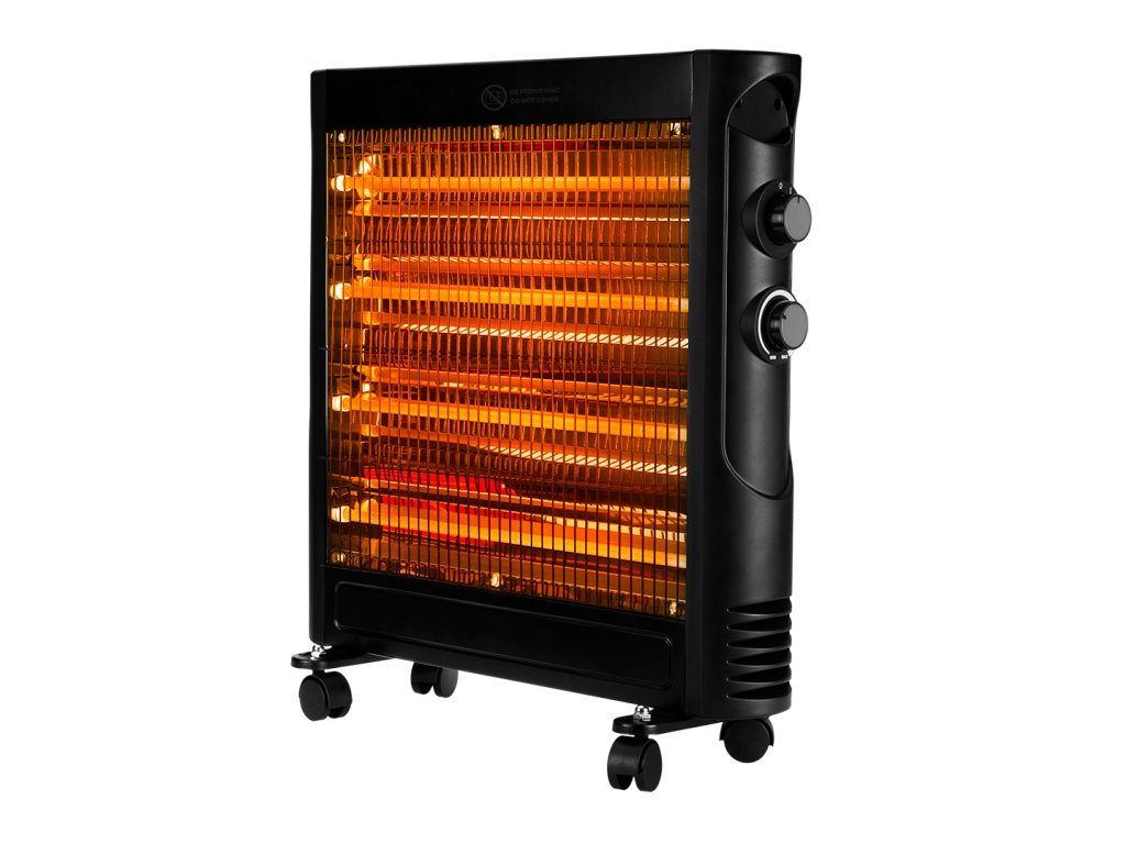 Kremenný infračervený ohrievač, výkon: 600/1200 W, napätie: Dĺžka: 1200 x 1200 V, 50-60 Hz, vykurovacie teleso - 4 kremenné trubice, bezpečnostný spínač s 360 stupňovým vypínačom, chrómová mriežka, s termostatom, na kolieskach, rozmery (D*Š*V): 50x20,5x56 cm