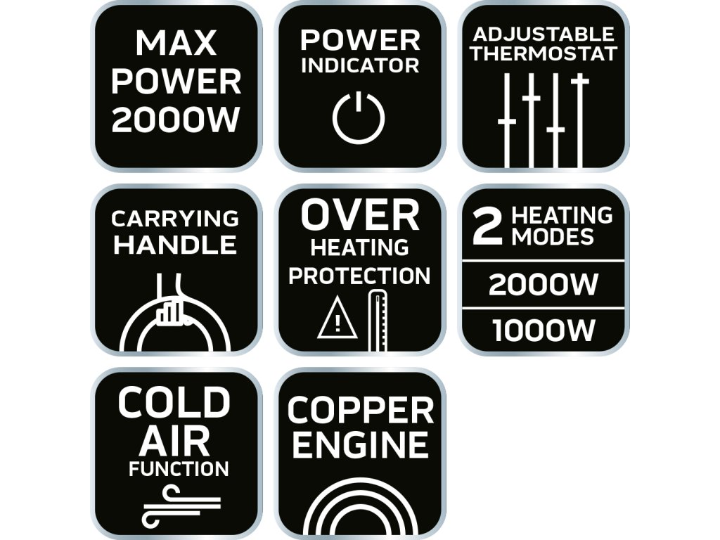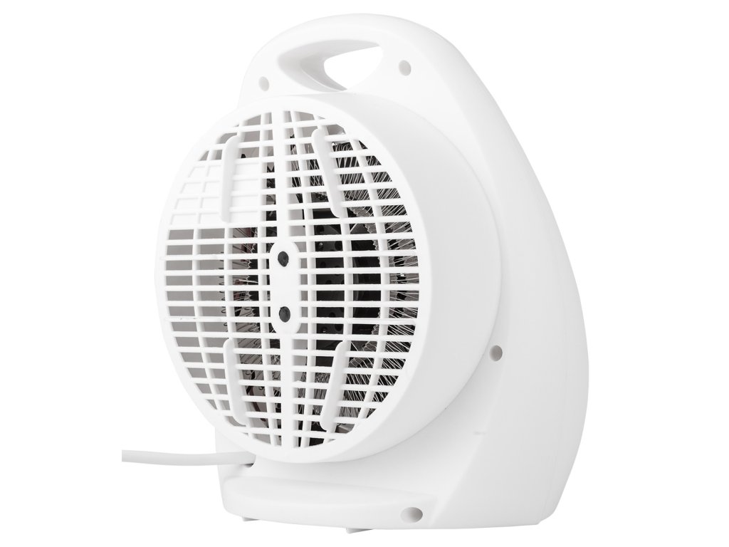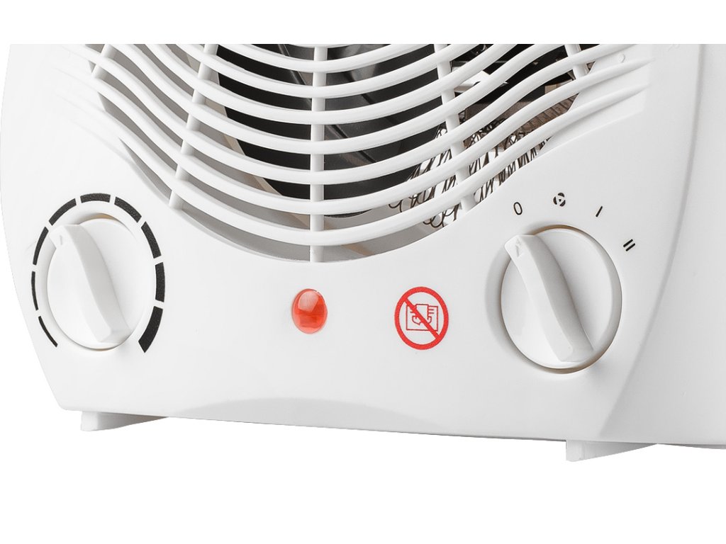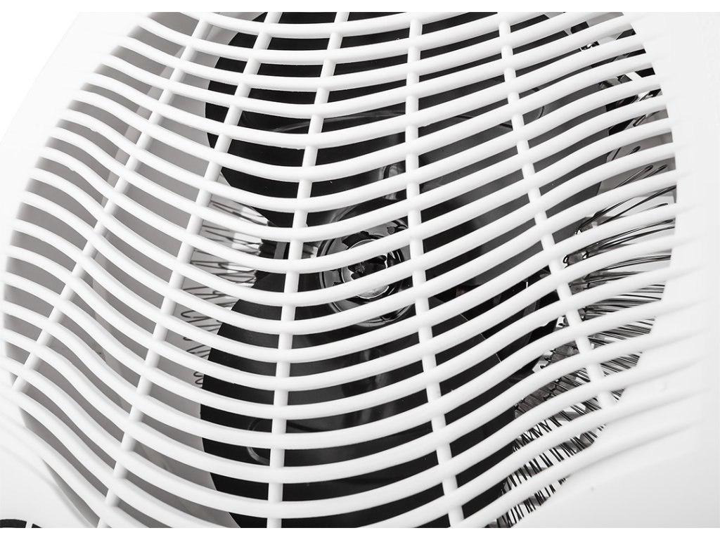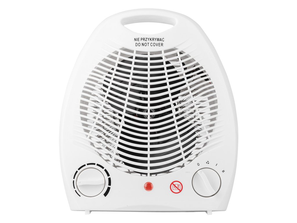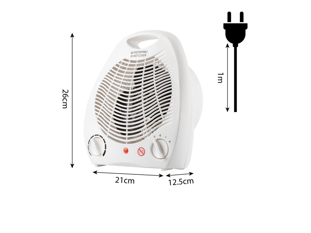 Ventilátorový ohrievač 2 stupne 1000W/2000W, nastaviteľný termostat, vnútorná poistka, svetelný indikátor výkonu, prenosný s rukoväťou, medený motor s ochranou proti prehriatiu, napájanie 230V 50Hz, dĺžka kábla 1m, vykurovacia plocha 25m2