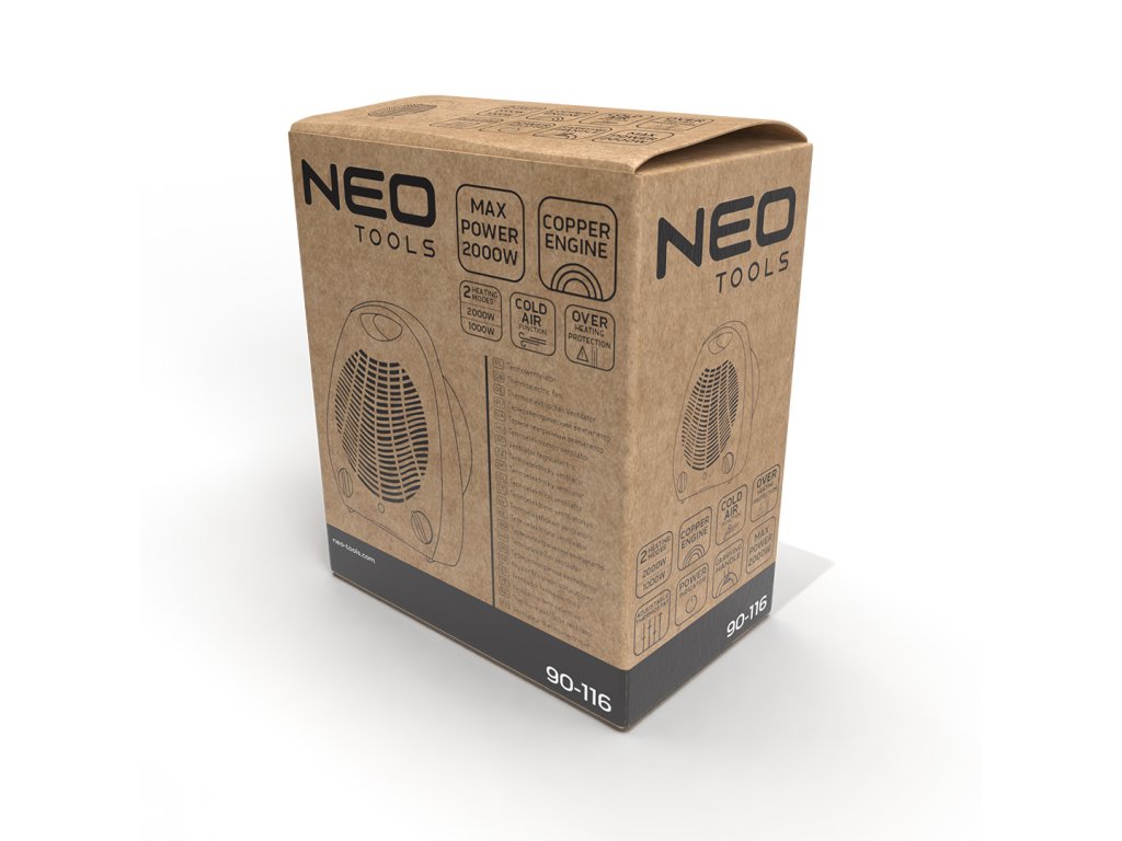 Termo ventilátor 2000 W 90-116 od spoločnosti NEO TOOLS je zariadenie pre malé miestnosti, pomocou ktorého môžete účinne zvýšiť teplotu, a tým aj pohodlie obyvateľov. Vyznačuje sa 2 stupňami vykurovania s výkonom 1000 W a 2000 W. Má praktickú ochranu proti prehriatiu a vnútornú poistku. Vďaka nastaviteľnému termostatu a svetelnému indikátoru výkonu zvyšuje komfort. Zabudovaný medený motor s bezpečnostnými prvkami ponúka bezpečnosť pri používaní tohto ohrievača s ventilátorom. Má rukoväť na prenášanie a 1 m dlhý kábel. Je napájaný zo siete 230 V 50 Hz. Ventilátorový ohrievač NEO TOOLS sa osvedčí v mnohých situáciách