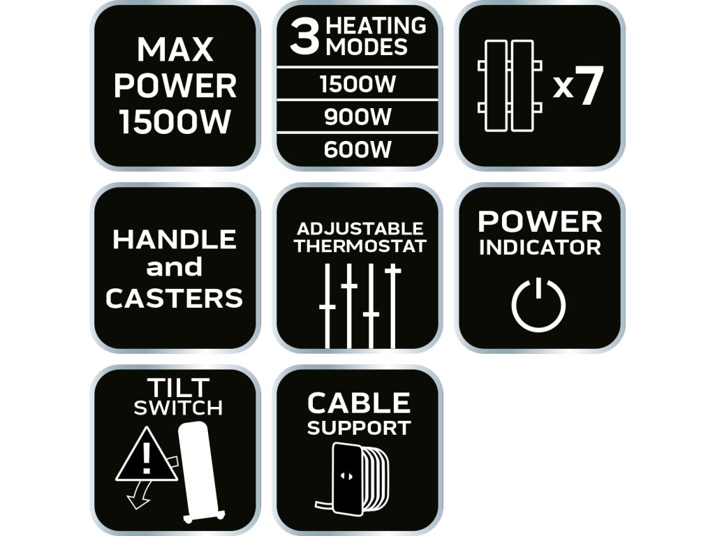 Olejový ohrievač 1500 W, 7 rebier, veľkosť rebier 120 mm × 500 mm, napájanie 230 V 50 Hz, 3 stupne ohrevu 600/900/1500 W, vypínač s kontrolkou, nastaviteľný termostat, ochrana proti prehriatiu, rukoväť a kolieska na ľahké premiestňovanie, držiak kábla, s prepínačom sklonu, dĺžka kábla 1,35 m, vykurovacia plocha 20 m2