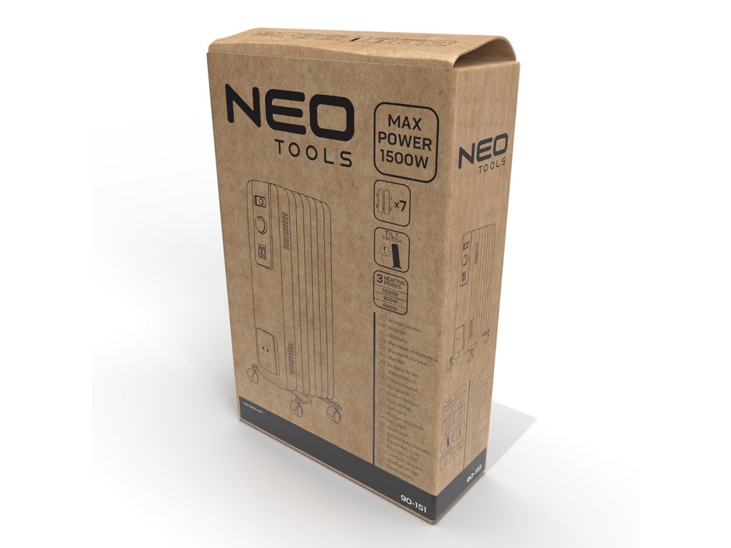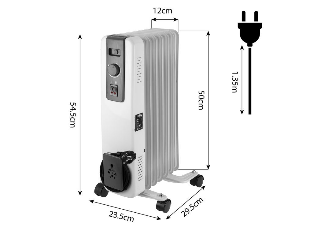 Olejový ohrievač NEO TOOLS je vybavený rukoväťou, kolieskami na ľahký pohyb a držiakom kábla (dĺžka kábla 1,35 m). Je prispôsobený na štandardné napájanie 230 V 50 Hz. Bude dobre fungovať pri vykurovaní malých miestností.
