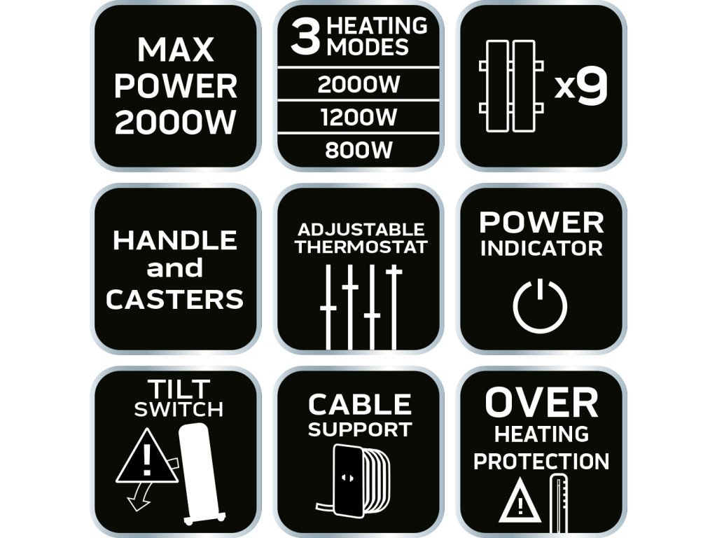 Olejový ohrievač 2000W 9 lamiel, veľkosť lamiel 120mm × 500mm, napájanie 230V 50Hz, 3 stupne ohrevu 800/1200/2000W, vypínač s kontrolkou, nastaviteľný termostat, ochrana proti prehriatiu, rukoväť a kolieska na ľahké premiestňovanie, držiak kábla, s prepínačom sklonu, dĺžka kábla 1,35m, vykurovacia plocha 25m2