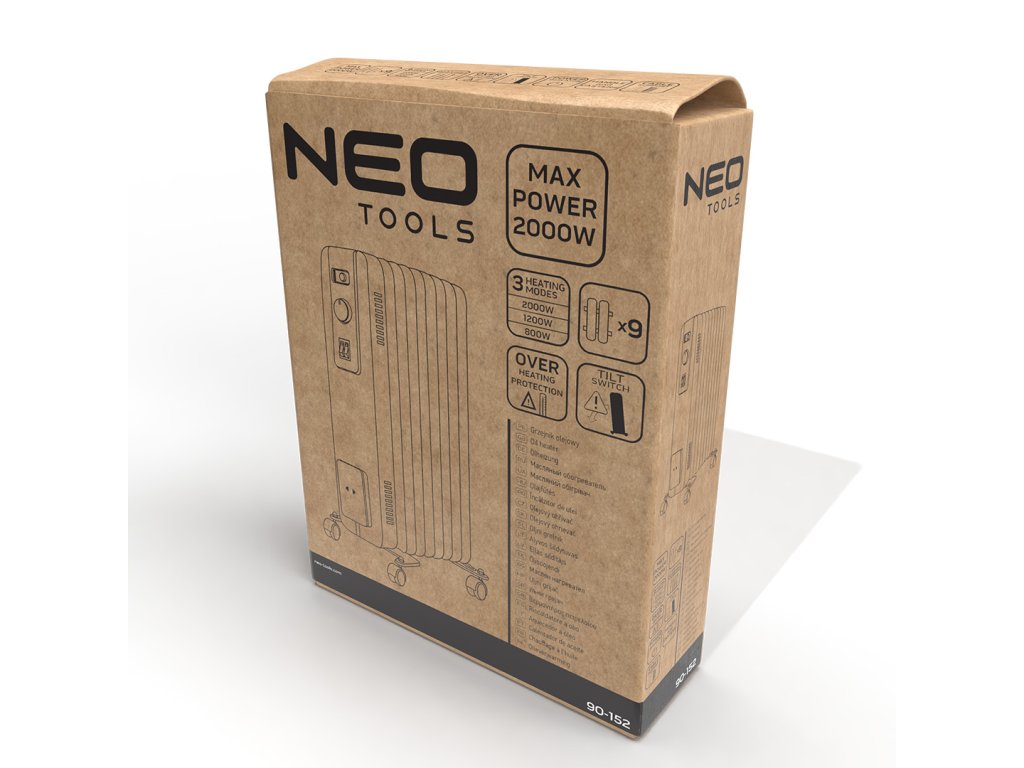 2000 W 9 rebrový olejový ohrievač 90-152 od spoločnosti NEO TOOLS je zariadenie s 3 stupňami ohrevu: 800, 1200 a 2000 W. Je vybavené 9 rebrami s rozmermi 120 x 500 mm. Ohrievač má vypínač s kontrolkou a nastaviteľný termostat. Vďaka ochrane proti prehriatiu a prepínaču naklonenia ovplyvňuje bezpečnosť jeho používania.