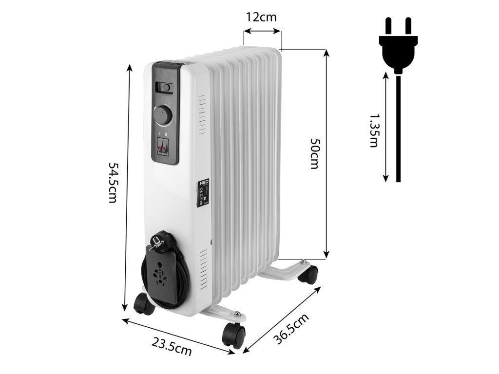 Olejový ohrievač NEO TOOLS je vybavený rukoväťou, kolieskami na ľahký pohyb a držiakom kábla (dĺžka kábla 1,35 m). Je prispôsobený na štandardné napájanie 230 V 50 Hz. Bude dobre fungovať pri vykurovaní malých miestností.
