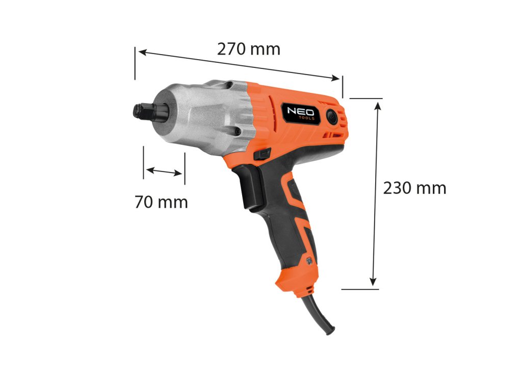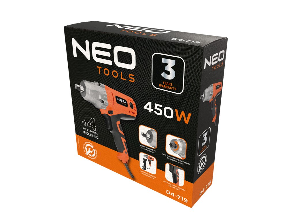 Rázový uťahovák 450 W, 350 Nm 04-720 od spoločnosti NEO je náradie s výkonom 450 W na dielenské práce spojené s uťahovaním a demontážou skrutiek. Osvedčí sa v profesionálnych vulkanizačných dielňach, pri úlohách pokrývača, mechanika, stavbára alebo tesára. Neoceniteľným pomocníkom bude aj pri použití v domácnosti. Kľúč dosahuje otáčky 3 000 ot/min, vyznačuje sa maximálnym krútiacim momentom vľavo350 Nm a vpravo: 180 Nm. Je vybavený ?" rukoväťou a je vhodný pre najbežnejší typ rázových nástrčiek. Sada ponúka 4 nástrčné hlavice vo veľkostiach 17,19,21,22 milimetrov. Ergonomický tvar kľúča umožňuje efektívnu prácu za všetkých podmienok. Vďaka tomu, že je poháňaný elektricky, nevyžaduje pneumatický systém. Má 6 m dlhý kábel. Vďaka svojej všestrannosti je kľúč značky NEO vynikajúcim doplnkom dielní.