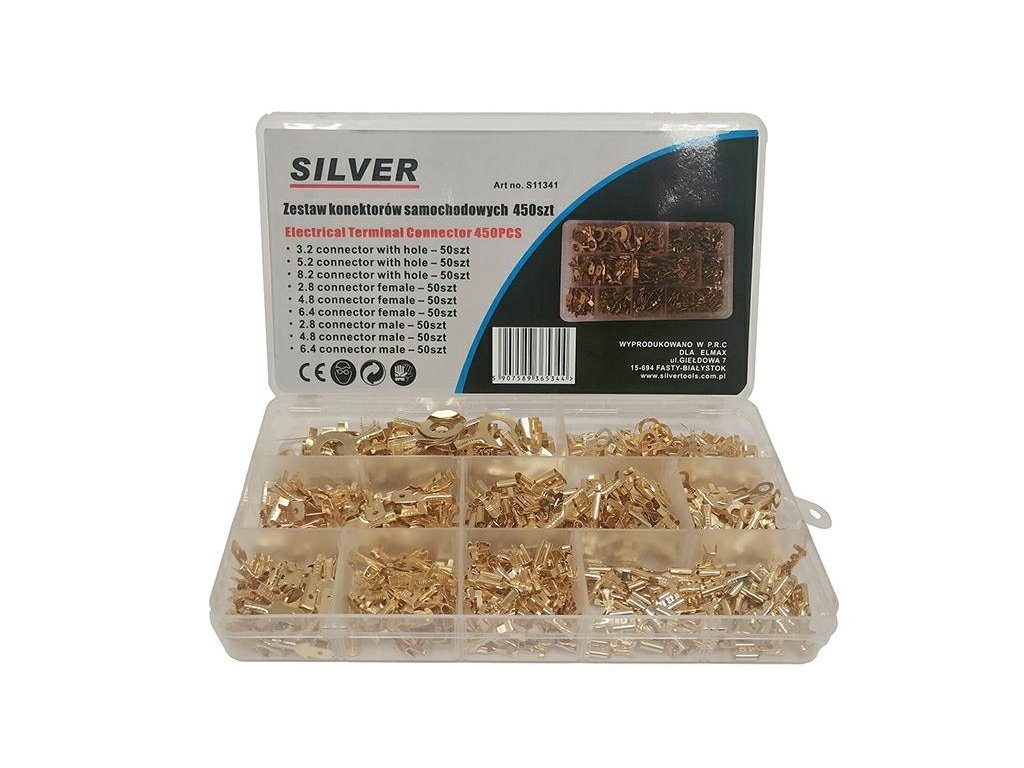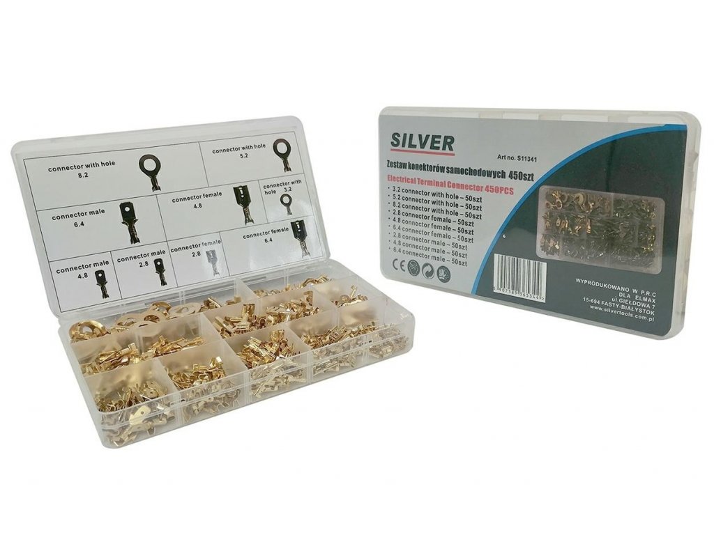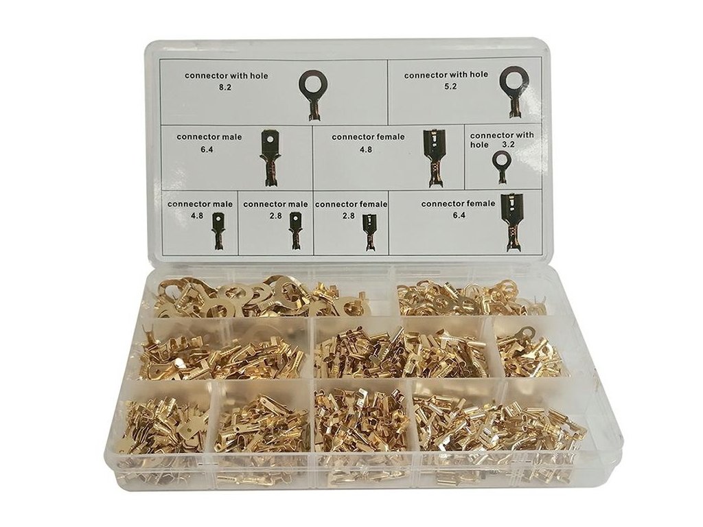 Sada 450 kusov automobilových káblových konektorov v zlatej farbe, rôznych typoch, zásuvky a k ním prislúchajúce konektory (samec, samica) a skrutkové okrúhle konektory (očkové). Celý komplet je umiestnený v priehľadnom plastovom boxe, rozdelené v priehradkách podľa typov.