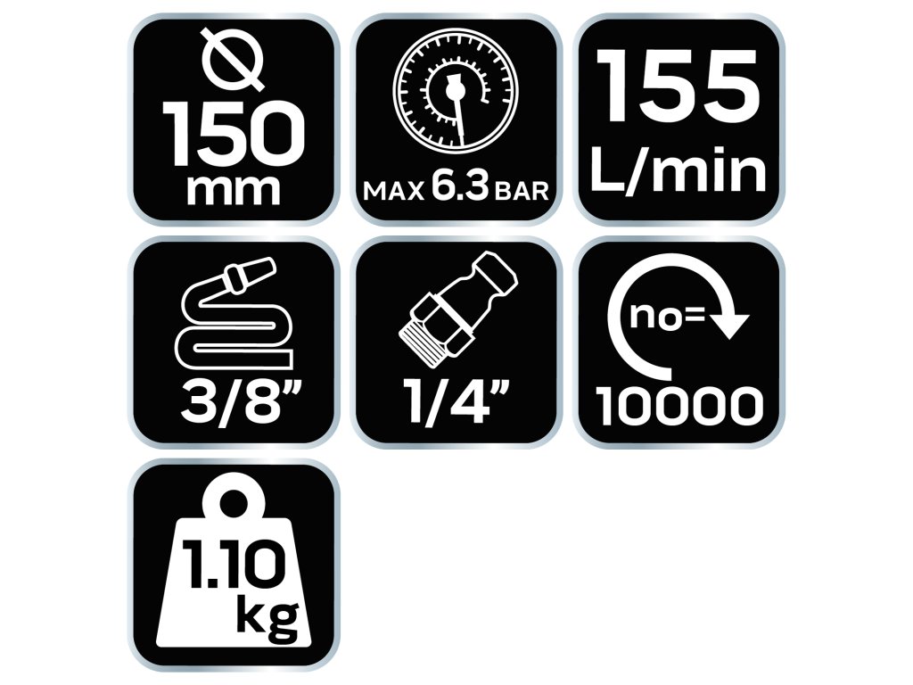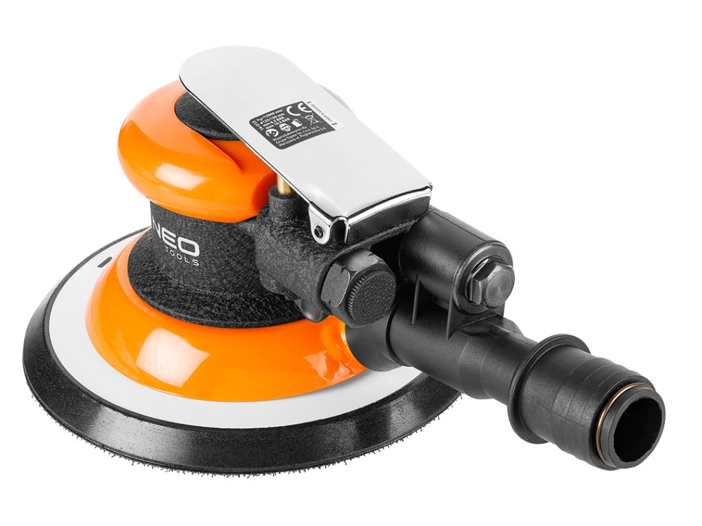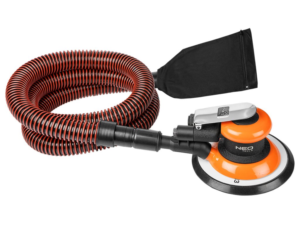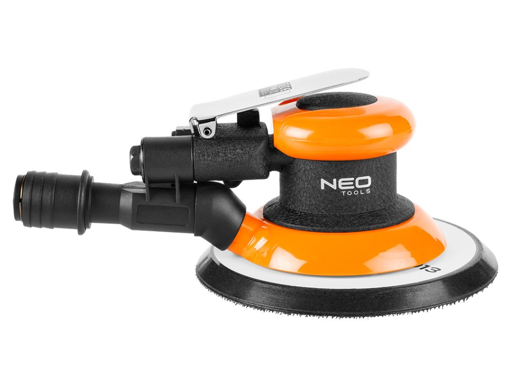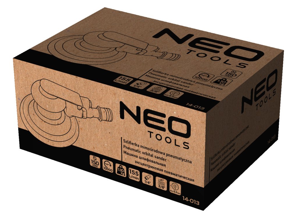 Pneumatická excentrická brúska 150 mm, vákuové odsávanie prachu 14-013 od spoločnosti NEO je zariadenie s priemerom kotúča 125/150 mm. Dosahuje rýchlosť 12 000 otáčok za minútu a jeho priemerná spotreba vzduchu je 133 l/min. Brúska pracuje pri pracovnom tlaku 6,3 baru. Na udržanie čistoty na pracovisku je zabudovaný centrálny systém odsávania prachu. Brúska má konektor 1/4" a hadicu s priemerom 3/8". Jeho hmotnosť je len 1,1 kg. Certifikát CE potvrdzuje zhodu s európskymi normami.