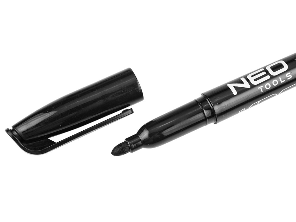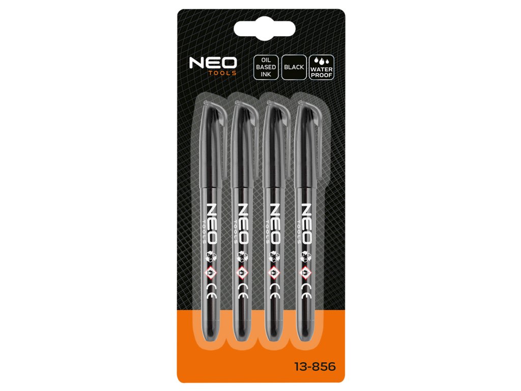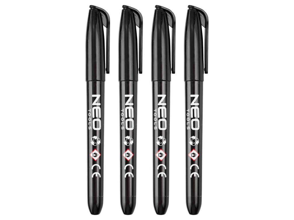 Stavebný popisovač, čierny, permanentný, vodeodolný, na olejovej báze, 4 kusy 13-856 od NEO TOOLS je sada 4 stavebných popisovačov s okrúhlym hrotom s priemerom 4 mm. Popisovač sa vyznačuje čiernym atramentom. Je na olejovej báze, permanentný, rýchloschnúci a vodeodolný. Skvele sa hodí na použitie na rôznych povrchoch vrátane kovu, skla, kameňa, dreva a plastu. Odporúča sa na profesionálne aj domáce použitie.