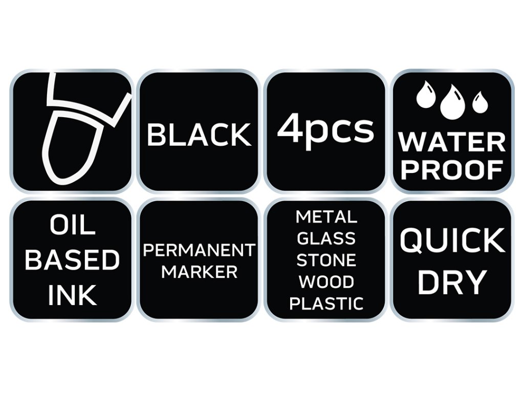 Stavebný popisovač s okrúhlym hrotom, čierny atrament, na olejovej báze, permanentný, rýchloschnúci, vodeodolný, sada obsahuje 4 kusy, na použitie na rôzne povrchy kov, sklo, kameň, drevo, plast.