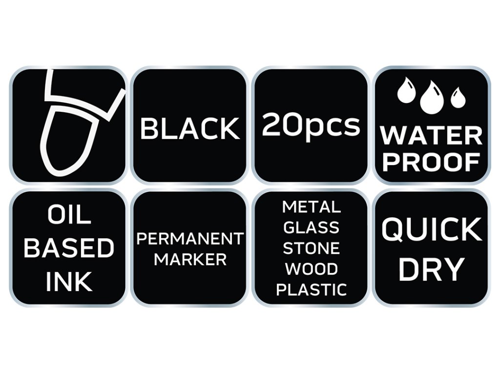 Stavebný popisovač s okrúhlym hrotom, čierny atrament, na olejovej báze, permanentný, rýchloschnúci, vodeodolný, sada obsahuje 20 kusov, na použitie na rôzne povrchy kov, sklo, kameň, drevo, plast.