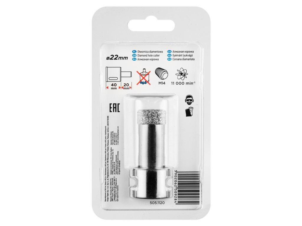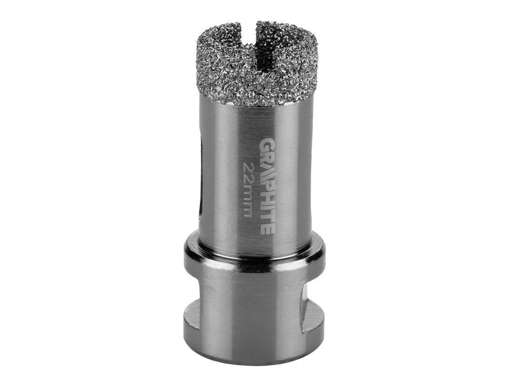 Diamantová píla na otvory GRAPHITE (ref. 55H306) s priemerom 22 mm a závitom M14 je určená na presné rezanie kameňa, kameniny, dlaždíc, skla, asfaltu, tehál a betónu. Vďaka použitiu diamantu sa rezná sila sústreďuje na malú plochu, čo eliminuje riziko prasknutia alebo poškodenia povrchu. Vhodné na prácu v suchu. Píla na otvory bola vákuovo spájkovaná pre zvýšenie odolnosti.