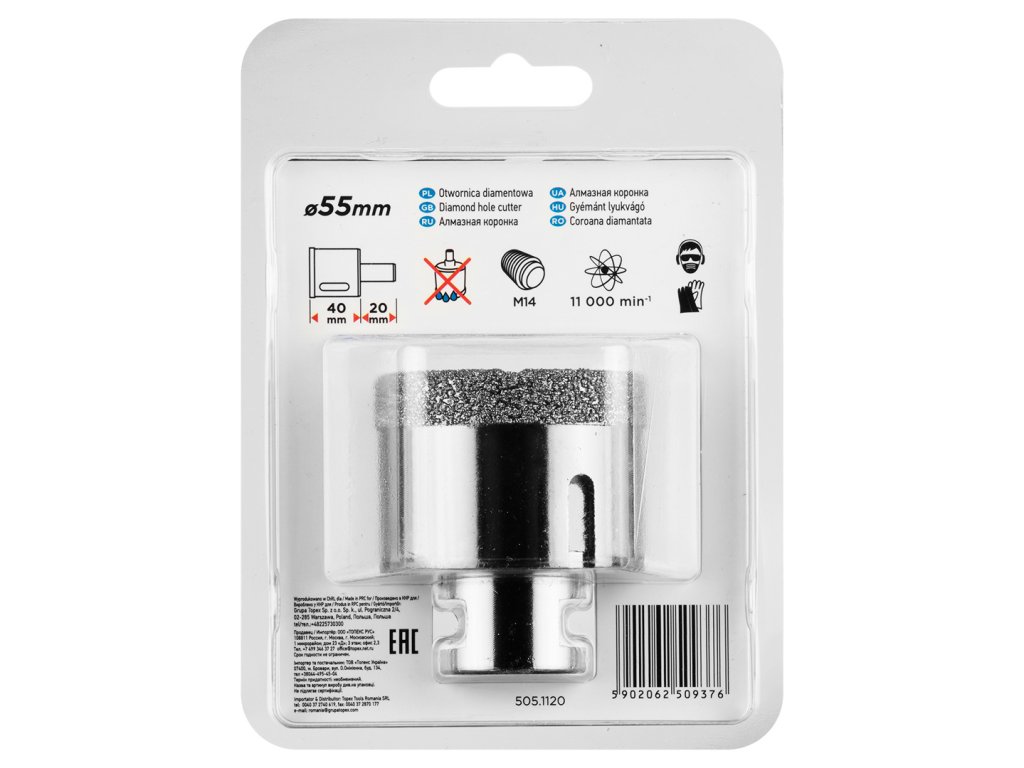 Diamantový otvor, priemer 55 mm, pracovná dĺžka 40 mm, celková dĺžka 60 mm, závit M14, vákuovo spájkovaný, na suchý chod, 11000 ot.
