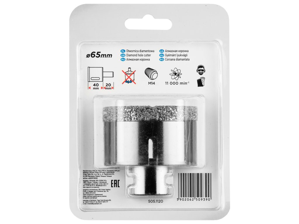 Diamantový otvor, priemer 65 mm, pracovná dĺžka 40 mm, celková dĺžka 60 mm, závit M14, vákuovo spájkovaný, pre suchý chod, 11000 ot/min.